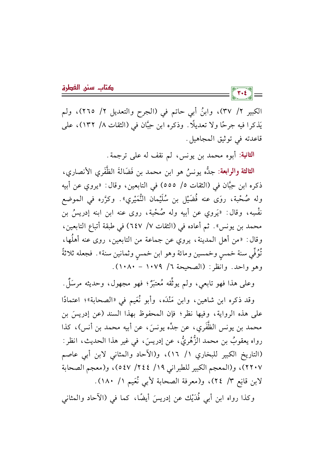 الثالثة والرابعة: جدُّه يونسُ هو ابن محمد بن فَضَالةَ الظَّفَري الأنصاري، ذكره ابن حِبَّان في (الثقات ٥/ ٥٥٥) في التابعين، وقال: "يروي عن أبيه وله صُحْبة، روَى عنه فُضَيْل بن سُلَيْمان النُّمَيْري". وكرَّره في الموضع نفْسِه، وقال: "يَروي عن أبيه وله صُحْبة، روى عنه ابن ابنه إدريسُ بن محمد بن يونس". ثم أعاده في (الثقات ٧/ ٦٤٧) في طبقة أتباع التابعين، وقال: "من أهل المدينة، يروي عن جماعة من التابعين، روى عنه أهلُها، تُوُفِّي سنة خمسٍ وخمسين ومائة وهو ابن خمسٍ وثمانين سنة". فجعله ثلاثةً وهو واحد. وانظر (الصحيحة ٦/ ١٠٧٩ - ١٠٨٠).