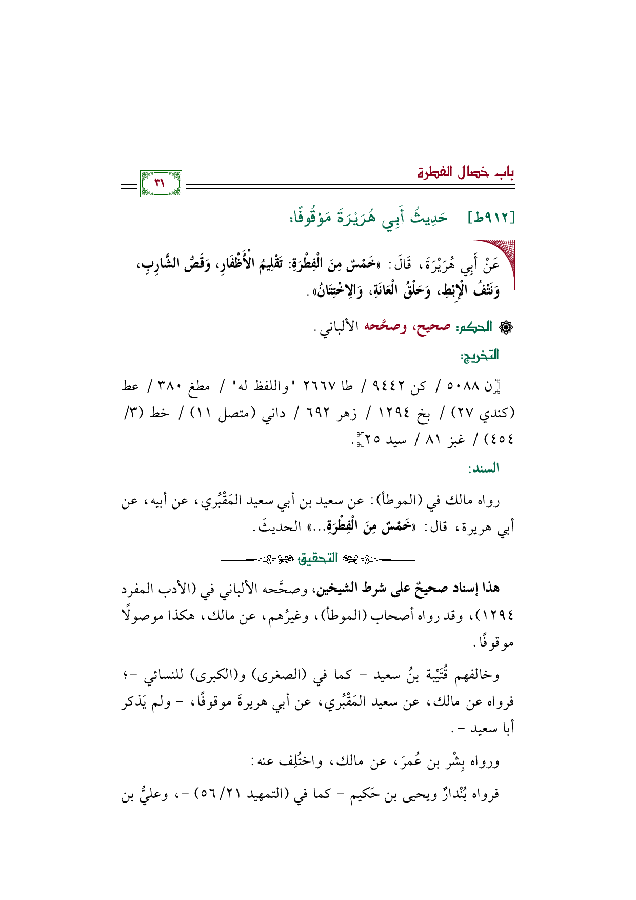 رواه مالك في "الموطأ": عن سعيد بن أبي سعيد المَقْبُري، عن أبيه، عن أبي هريرة، قال: ((خَمْسٌ مِنَ الْفِطْرَةِ ... )) الحديثَ.