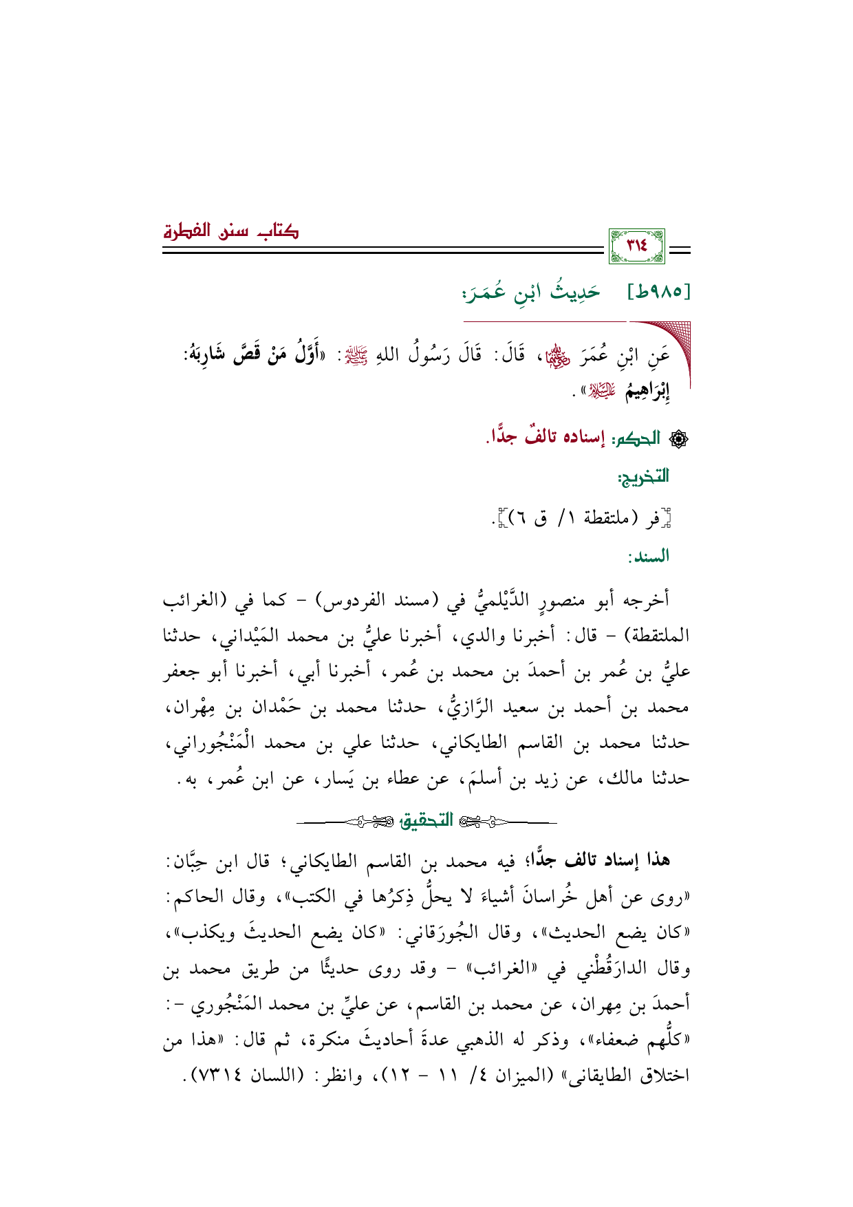 أخرجه أبو منصورٍ الدَّيْلميُّ في "مسند الفردوس"- كما في "الغرائب الملتقطة"- قال: أخبرنا والدي، أخبرنا عليُّ بن محمد المَيْداني، حدثنا عليُّ بن عُمر بن أحمدَ بن محمد بن عُمر، أخبرنا أبي، أخبرنا أبو جعفر محمد بن أحمد بن سعيد الرَّازيُّ، حدثنا محمد بن حَمْدان بن مِهْران، حدثنا محمد بن القاسم الطايكاني، حدثنا علي بن محمد الْمَنْجُوراني، حدثنا مالك، عن زيد بن أسلمَ، عن عطاء بن يَسار، عن ابن عُمر، به.