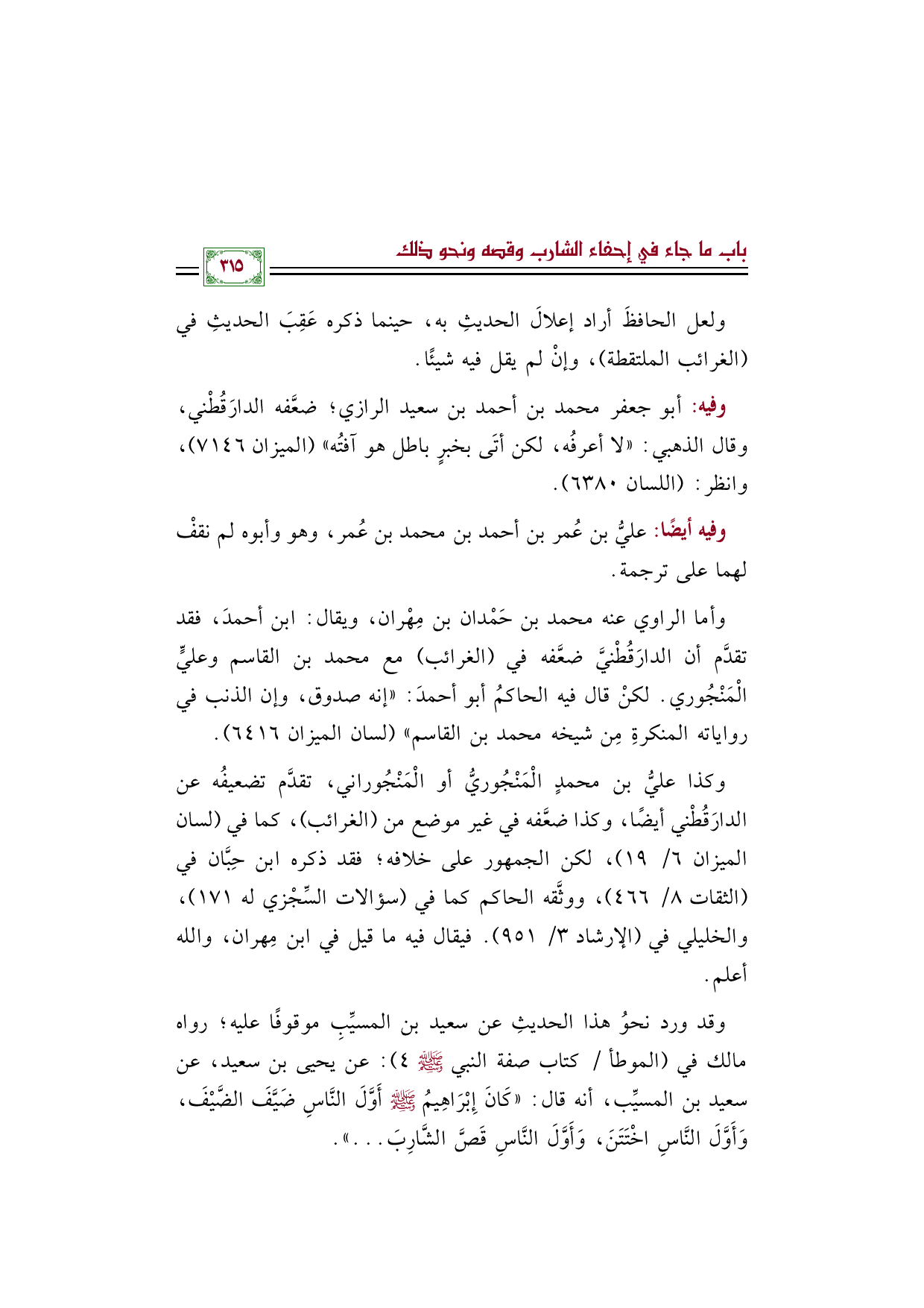 وكذا عليُّ بن محمدٍ الْمَنْجُوريُّ أو الْمَنْجُوراني، تقدَّم تضعيفُه عن الدارَقُطْني أيضًا، وكذا ضعَّفه في غير موضع من "الغرائب"، كما في (لسان الميزان ٦/ ١٩)، لكن الجمهور على خلافه؛ فقد ذكره ابن حِبَّان في (الثقات ٨/ ٤٦٦)، ووثَّقه الحاكم كما في (سؤالات السِّجْزي له ١٧١)، والخليلي في (الإرشاد ٣/ ٩٥١). فيقال فيه ما قيل في ابن مِهران، والله أعلم.
