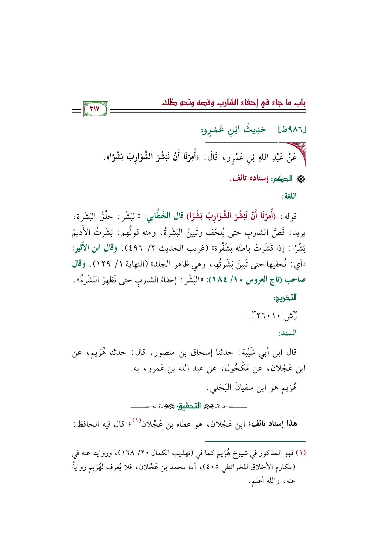 قال ابن أبي شَيْبة: حدثنا إسحاق بن منصور، قال: حدثنا هُرَيم، عن ابن عَجْلان، عن مَكْحُول، عن عبد الله بن عَمرو، به.