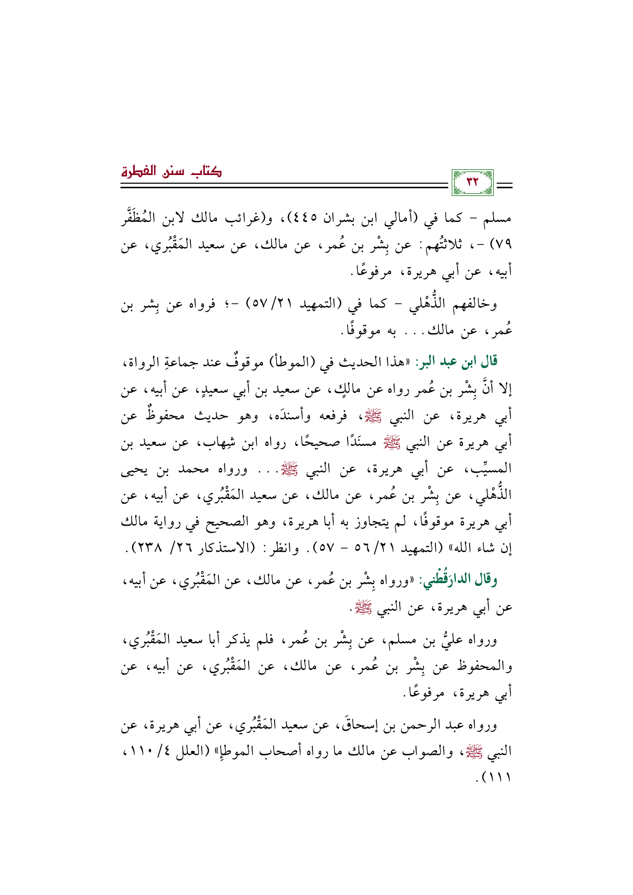 قال ابن عبد البر: "هذا الحديث في "الموطأ" موقوفٌ عند جماعةِ الرواة، إلا أنَّ بِشْر بن عُمر رواه عن مالكٍ، عن سعيد بن أبي سعيدٍ، عن أبيه، عن أبي هريرة، عن النبي صلى الله عليه وسلم، فرفعه وأسندَه، وهو حديث محفوظٌ عن أبي هريرة عن النبي صلى الله عليه وسلم مسنَدًا صحيحًا، رواه ابن شِهاب، عن سعيد بن المسيِّب، عن أبي هريرة، عن النبي صلى الله عليه وسلم ... ورواه محمد بن يحيى الذُّهْلي، عن بِشْر بن عُمر، عن مالك، عن سعيد المَقْبُري، عن أبيه، عن أبي هريرة موقوفًا، لم يتجاوز به أبا هريرة، وهو الصحيح في رواية مالك إن شاء الله" (التمهيد ٢١/ ٥٦ - ٥٧). وانظر (الاستذكار ٢٦/ ٢٣٨).