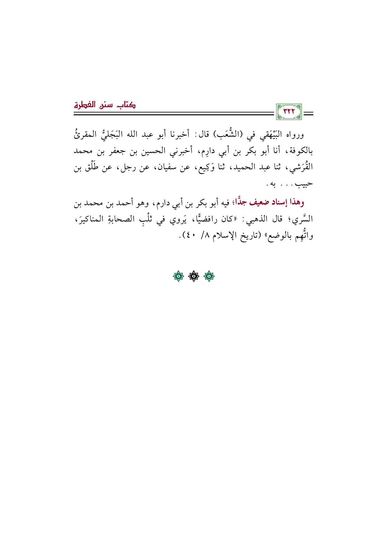 ورواه البَيْهَقي في (الشُّعَب) قال: أخبرنا أبو عبد الله البَجَليُّ المقرئُ بالكوفة، أنا أبو بكر بن أبي دارِم، أخبرني الحسين بن جعفر بن محمد القُرَشي، ثنا عبد الحميد، ثنا وَكِيع، عن سفيان، عن رجل، عن طَلْق بن حبيب ... به.
