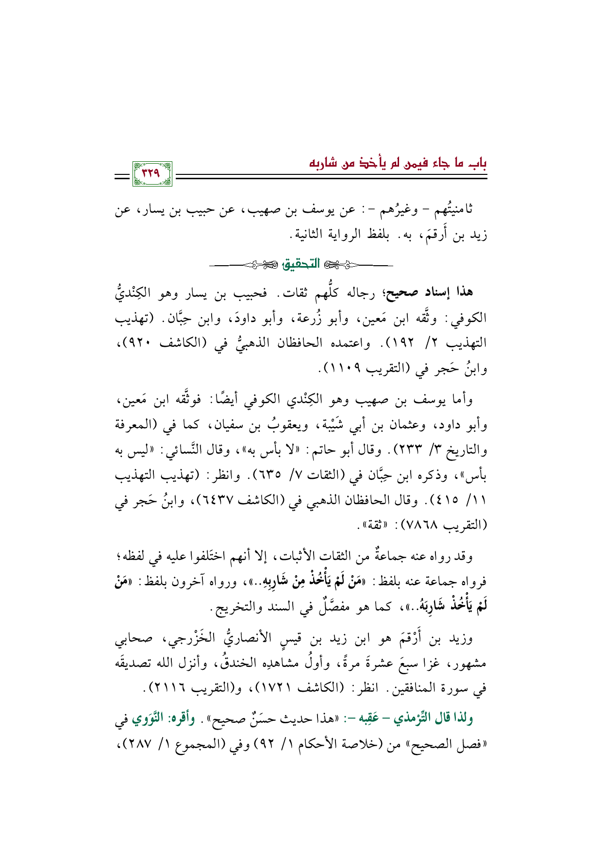 ولذا قال التِّرْمذي- عَقِبه-: "هذا حديث حسَنٌ صحيح". وأقره: النَّوَوي في "فصل الصحيح" من (خلاصة الأحكام ١/ ٩٢) وفي (المجموع ١/ ٢٨٧)،