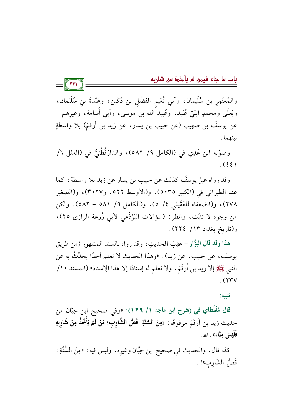 وقد رواه غيرُ يوسفَ كذلك عن حبيب بن يسار عن زيد بلا واسطة، كما عند الطبراني في (الكبير ٥٠٣٥)، و (الأوسط ٥٢٢، و ٣٠٢٧)، و (الصغير ٢٧٨)، و (الضعفاء للعُقَيلي ٤/ ٥)، و (الكامل ٩/ ٥٨١ - ٥٨٢). ولكن من وجوه لا تثبُت، وانظر (سؤالات البَرْذَعي لأبي زُرعة الرازي ٢٥)، و (تاريخ بغداد ١٣/ ٢٢٤).