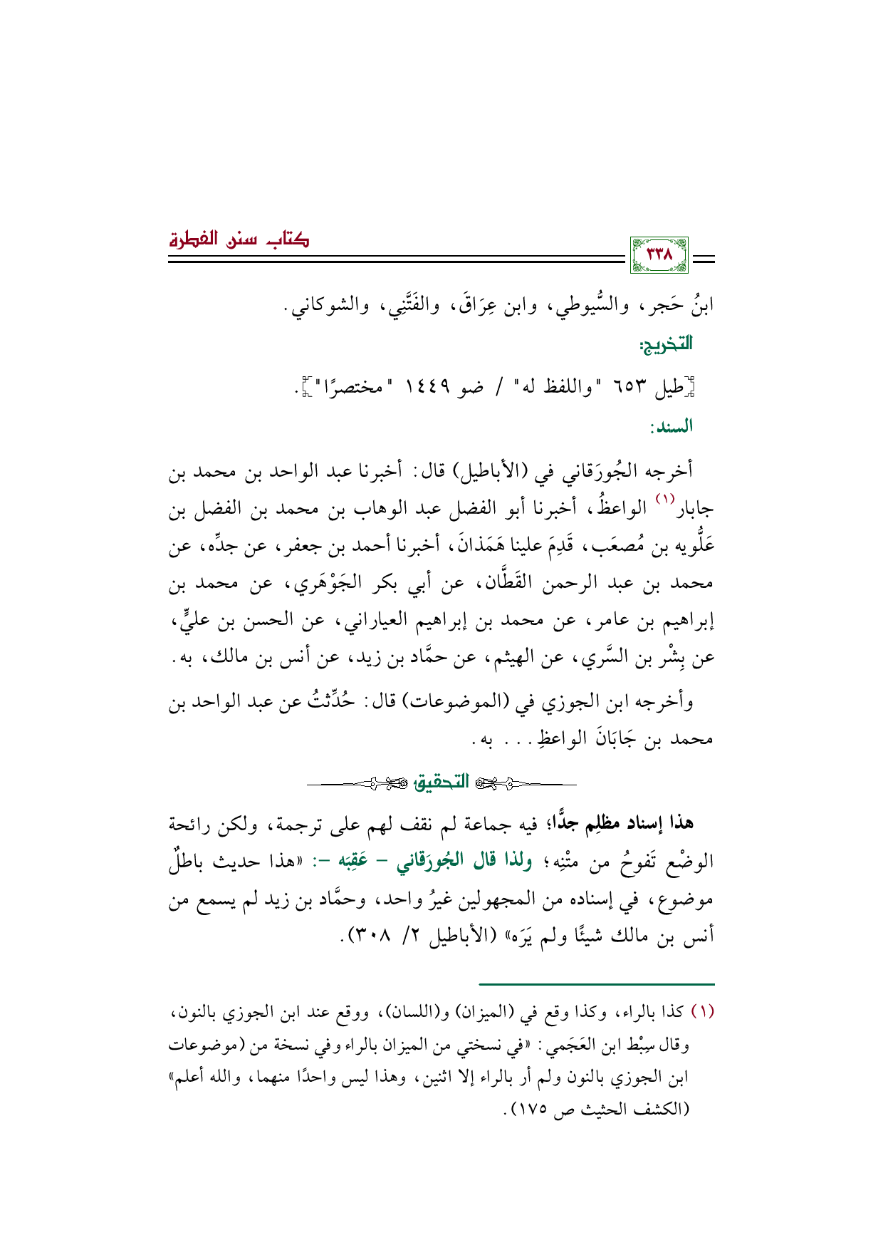 أخرجه الجُورَقاني في "الأباطيل" قال: أخبرنا عبد الواحد بن محمد بن جابار (¬١) الواعظُ، أخبرنا أبو الفضل عبد الوهاب بن محمد بن الفضل بن عَلُّويه بن مُصعَب، قَدِمَ علينا هَمَذانَ، أخبرنا أحمد بن جعفر، عن جدِّه، عن محمد بن عبد الرحمن القَطَّان، عن أبي بكر الجَوْهَري، عن محمد بن إبراهيم بن عامر، عن محمد بن إبراهيم العياراني، عن الحسن بن عليٍّ، عن بِشْر بن السَّري، عن الهيثم، عن حمَّاد بن زيد، عن أنس بن مالك، به.