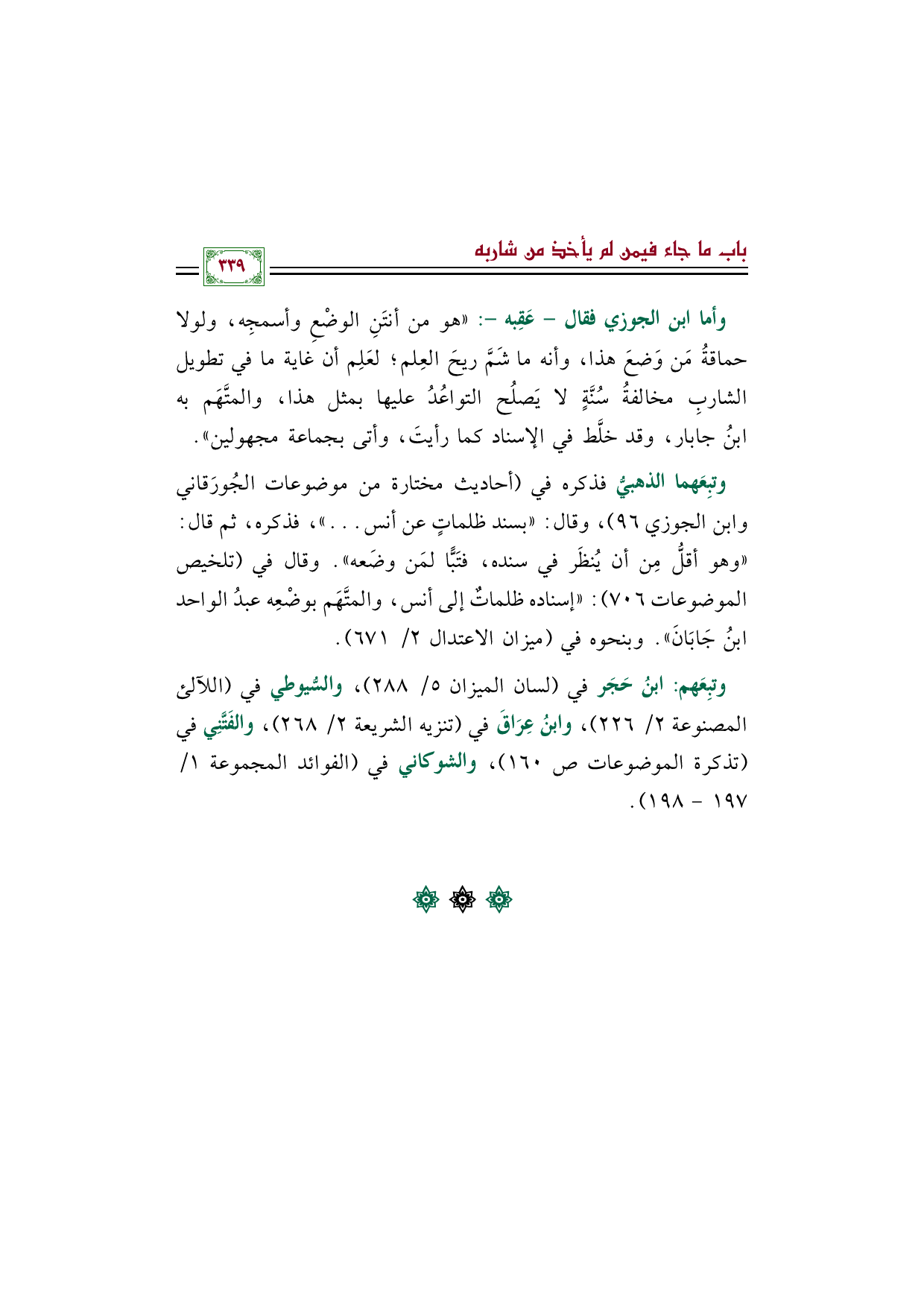 وتبِعَهم: ابنُ حَجَر في (لسان الميزان ٥/ ٢٨٨)، والسُّيوطي في (اللآلئ المصنوعة ٢/ ٢٢٦)، وابنُ عِرَاقَ في (تنزيه الشريعة ٢/ ٢٦٨)، والفَتَّنِي في (تذكرة الموضوعات ص ١٦٠)، والشوكاني في (الفوائد المجموعة ١/ ١٩٧ - ١٩٨).