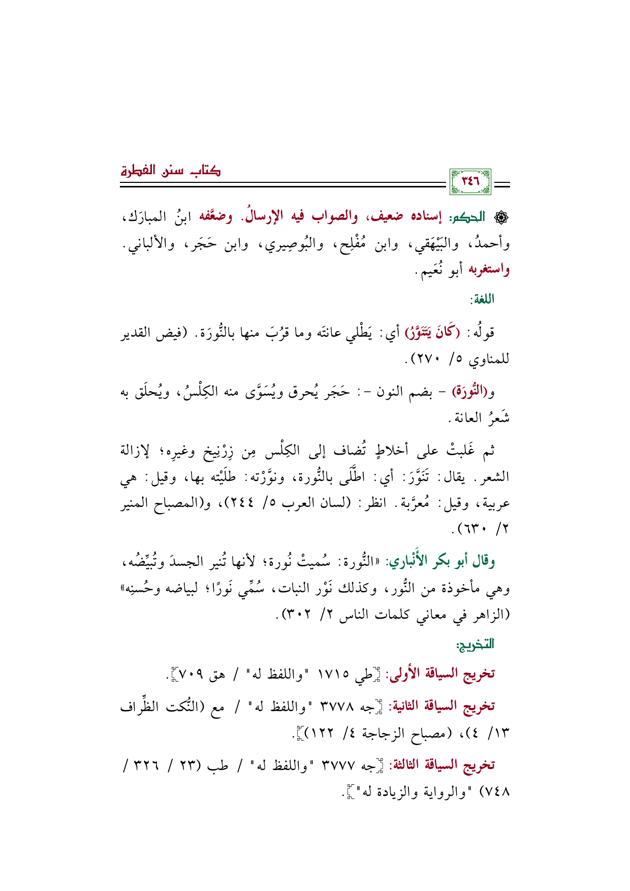ثم غَلبتْ على أخلاطٍ تُضاف إلى الكِلْس مِن زِرْنِيخ وغيرِه؛ لإزالة الشعر. يقال: تَنَوَّرَ: أي: اطَّلَى بالنُّورة، ونوَّرْته: طلَيْته بها، وقيل: هي عربية، وقيل: مُعرَّبة. انظر (لسان العرب ٥/ ٢٤٤)، و (المصباح المنير ٢/ ٦٣٠).