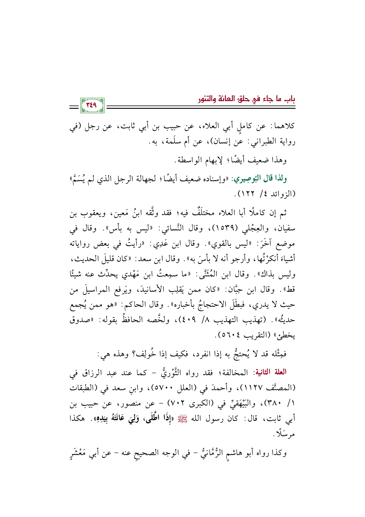 ثم إن كاملًا أبا العلاء مختلَفٌ فيه؛ فقد وثَّقه ابنُ مَعين، ويعقوب بن سفيان، والعِجْلي (١٥٣٩)، وقال النَّسائي: "ليس به بأس". وقال في موضع آخَرَ: "ليس بالقوي". وقال ابن عَدِي: "رأيتُ في بعض رواياته أشياءَ أنكرْتُها، وأرجو أنه لا بأسَ به". وقال ابن سعد: "كان قليلَ الحديث، وليس بذاك". وقال ابن المُثَنَّى: "ما سمِعتُ ابن مَهْدي يحدِّث عنه شيئًا قط". وقال ابن حِبَّان: "كان ممن يَقلِب الأسانيدَ، ويَرفع المراسيلَ من حيث لا يدري، فبطَلَ الاحتجاجُ بأخباره". وقال الحاكم: "هو ممن يُجمع حديثُه". (تهذيب التهذيب ٨/ ٤٠٩)، ولخَّصه الحافظُ بقوله: "صدوق يخطئ" (التقريب ٥٦٠٤).