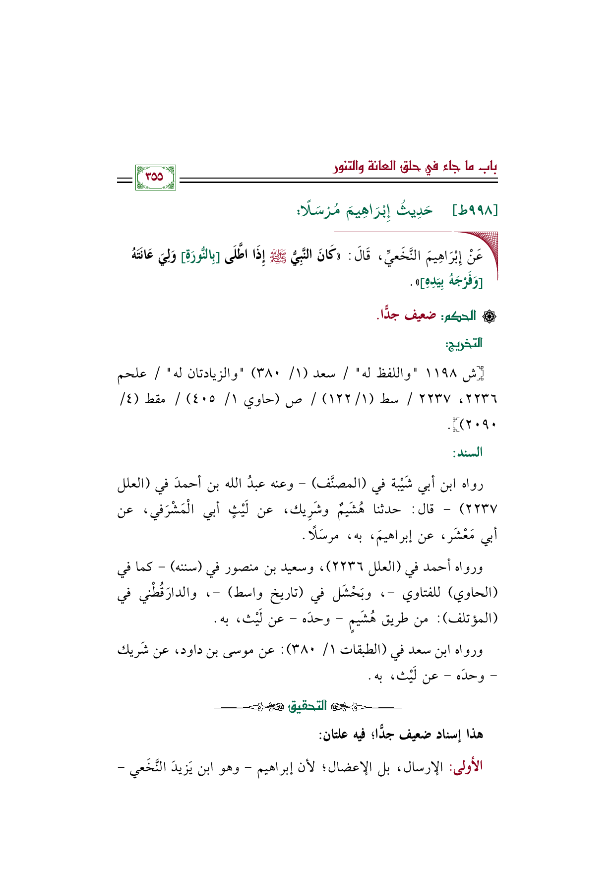 رواه ابن أبي شَيْبة في (المصنَّف) - وعنه عبدُ الله بن أحمدَ في (العلل ٢٢٣٧) - قال: حدثنا هُشَيمٌ وشَرِيك، عن لَيْثٍ أبي الْمَشْرَفي، عن أبي مَعْشَر، عن إبراهيمَ، به، مرسَلًا.