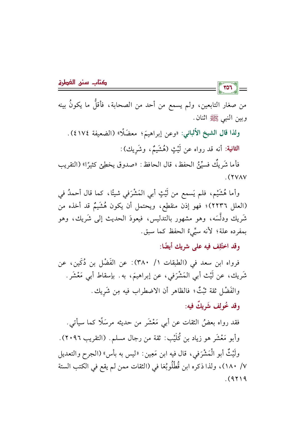 وأما هُشَيْم، فلم يَسمع من لَيْثٍ أبي المَشْرَفي شيئًا، كما قال أحمدُ في (العلل ٢٢٣٦)؛ فهو إذن منقطِع، ويحتمل أن يكون هُشَيمٌ قد أخذه من شَريك ودلَّسَه، وهو مشهور بالتدليس، فيعودَ الحديث إلى شَريك، وهو بمفرده علة؛ لأنه سيِّيءُ الحفظ كما سبق.