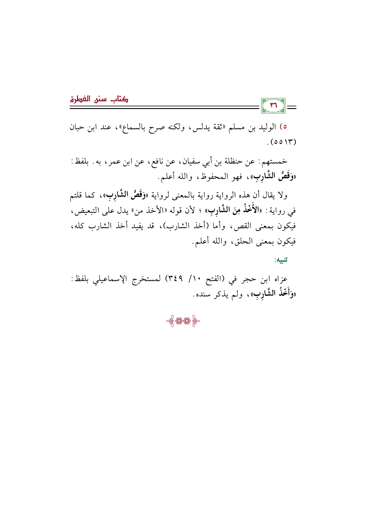 ولا يقال أن هذه الرواية رواية بالمعنى لرواية ((وَقَصُّ الشَّارِبِ))، كما قلتم في رواية: ((الأَخْذُ مِنْ الشَّارِبِ))؛ لأن قوله (الأخذ من) يدل على التبعيض، فيكون بمعنى القص، وأما (أخذ الشارب)، قد يفيد أخذ الشارب كله، فيكون بمعنى الحلق، والله أعلم.
