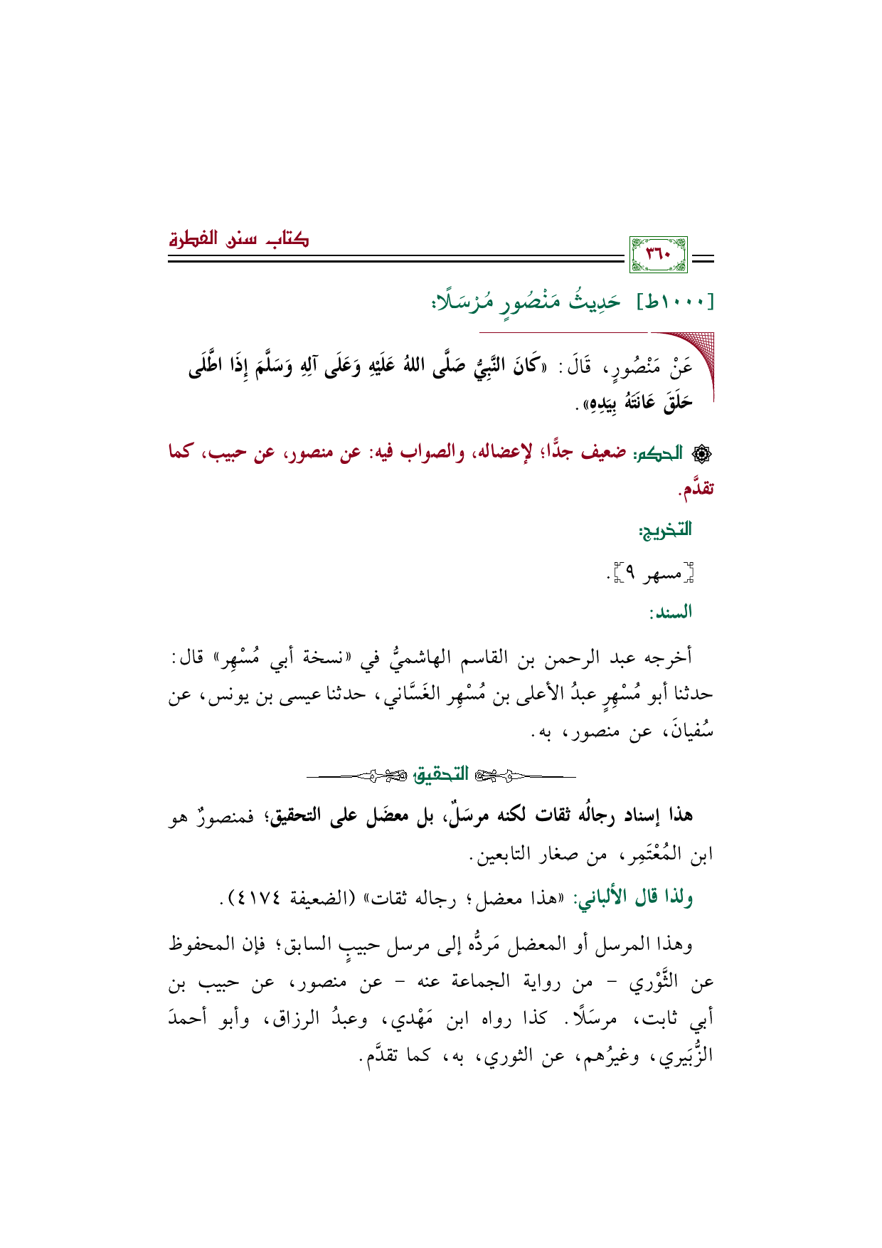 وهذا المرسل أو المعضل مَردُّه إلى مرسل حبيبٍ السابق؛ فإن المحفوظ عن الثَّوْري- من رواية الجماعة عنه- عن منصور، عن حبيب بن أبي ثابت، مرسَلًا. كذا رواه ابن مَهْدي، وعبدُ الرزاق، وأبو أحمدَ الزُّبَيري، وغيرُهم، عن الثوري، به، كما تقدَّم.