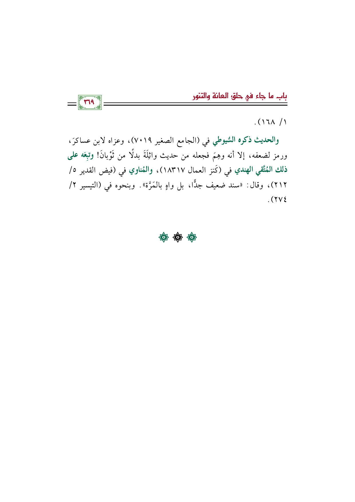والحديث ذكره السُّيوطي في (الجامع الصغير ٧٠١٩)، وعزاه لابن عساكرَ، ورمز لضعفه، إلا أنه وهِمَ فجعله من حديث واثِلَةَ بدلًا من ثَوْبانَ! وتبِعَه على ذلك المُتَّقي الهندي في (كَنز العمال ١٨٣١٧)، والمُناوي في (فيض القدير ٥/ ٢١٢)، وقال: "سند ضعيف جدًّا، بل واهٍ بالمَرَّة". وبنحوه في (التيسير ٢/ ٢٧٤).