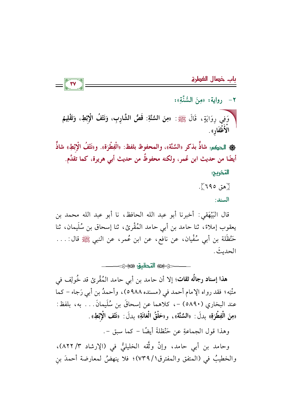 هذا إسناد رجالُه ثقات؛ إلا أن حامد بن أبي حامد المُقْرئ قد خُولِف في متْنِه؛ فقد رواه الإمام أحمد في (مسنده ٥٩٨٨)، وأحمدُ بن أبي رَجاء- كما عند البخاري (٥٨٩٠) -، كلاهما عن إسحاقَ بن سُلَيمانَ ... به، بلفظ: (مِنَ الْفِطْرَةِ) بدلَ: (السُّنَّة)، و (حَلْقُ الْعَانَةِ) بدلَ: (نَتْف الْإِبْطِ).