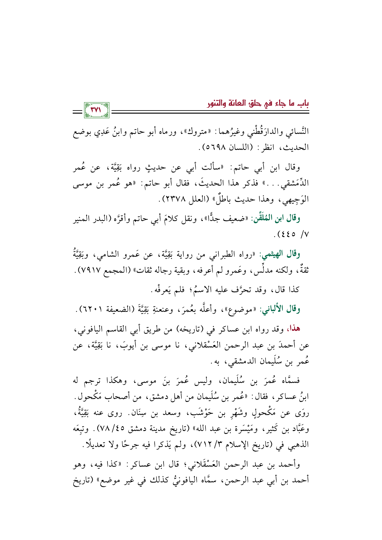 فسمَّاه عُمرَ بن سُلَيمان، وليس عُمرَ بنَ موسى، وهكذا ترجم له ابنُ عساكر، فقال: "عُمر بن سُلَيمان من أهل دمشق، من أصحاب مَكْحول. روَى عن مَكْحولٍ وشَهْرِ بن حَوْشَب، وسعد بن سِنَان. روى عنه بَقِيَّةُ، وعَبَّاد بن كَثير، ومَيْسَرة بن عبد الله" (تاريخ مدينة دمشق ٤٥/ ٧٨). وتبِعَه الذهبي في (تاريخ الإسلام ٣/ ٧١٢)، ولم يَذكرا فيه جرحًا ولا تعديلًا.