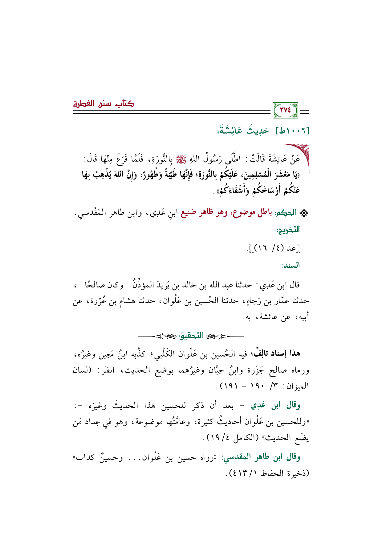 قال ابن عَدِي: حدثنا عبد الله بن خالد بن يَزيدَ المؤذِّنُ- وكان صالحًا-، حدثنا عمَّار بن رَجاءٍ، حدثنا الحُسين بن عَلْوان، حدثنا هشام بن عُرْوة، عن أبيه، عن عائشة، به.