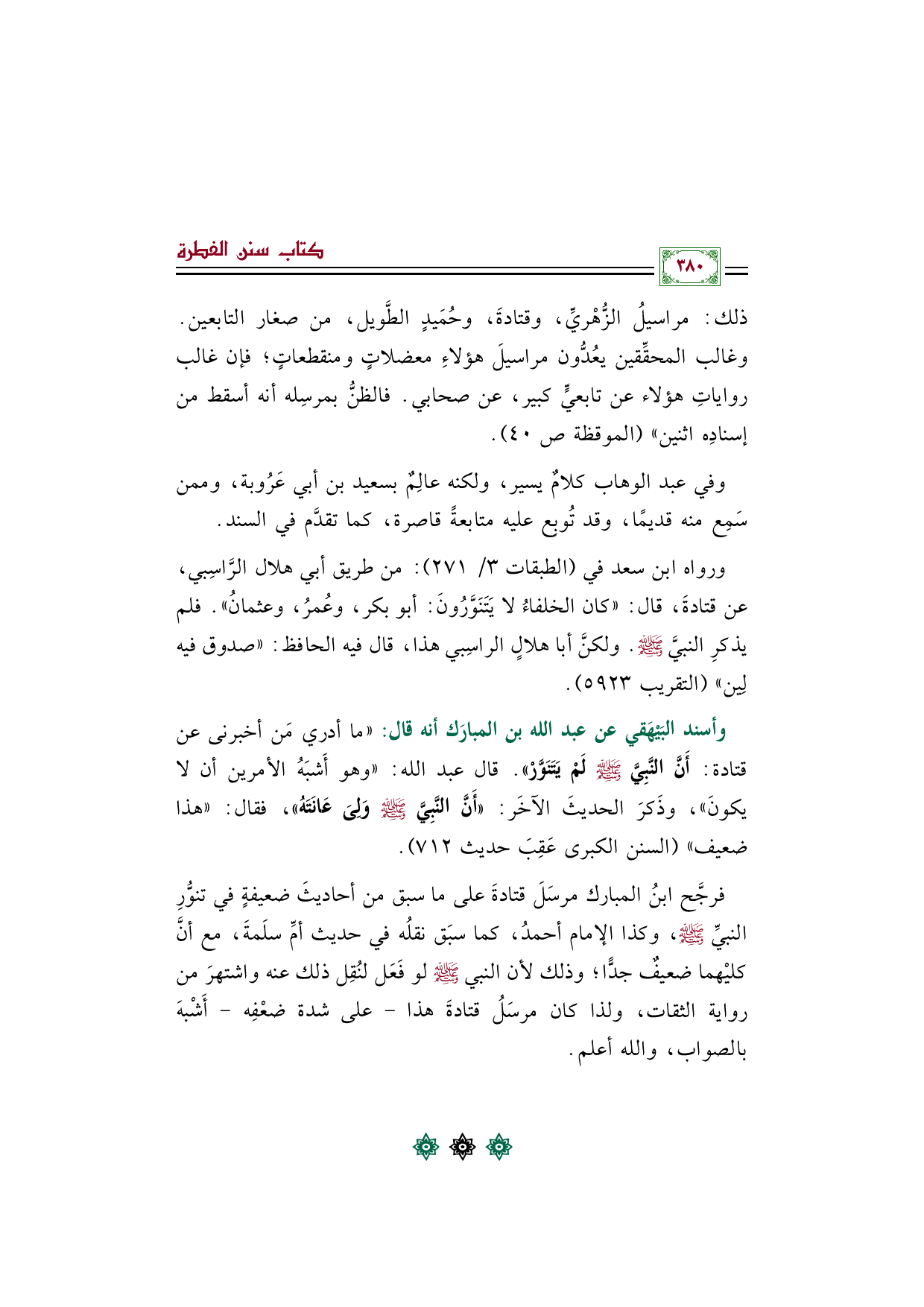 ورواه ابن سعد في (الطبقات ٣/ ٢٧١): من طريق أبي هلال الرَّاسِبي، عن قتادةَ، قال: ((كان الخلفاءُ لا يَتَنَوَّرُونَ: أبو بكر، وعُمرُ، وعثمانُ)). فلم يذكرِ النبيَّ صلى الله عليه وسلم. ولكنَّ أبا هلالٍ الراسِبي هذا، قال فيه الحافظ: "صدوق فيه لِين" (التقريب ٥٩٢٣).