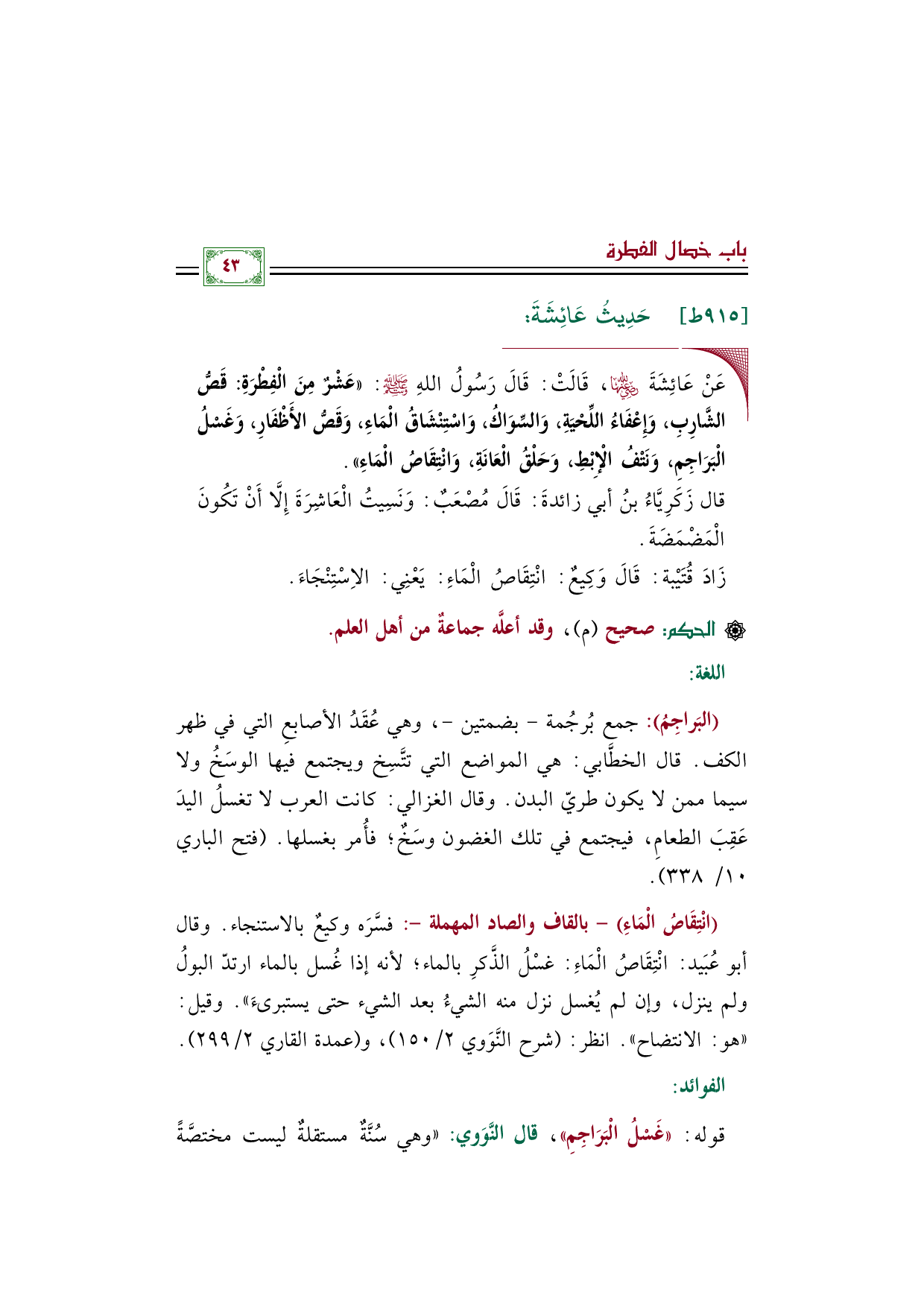 قوله: ((غَسْلُ الْبَرَاجِمِ))، قال النَّوَوي: "وهي سُنَّةٌ مستقلةٌ ليست مختصَّةً