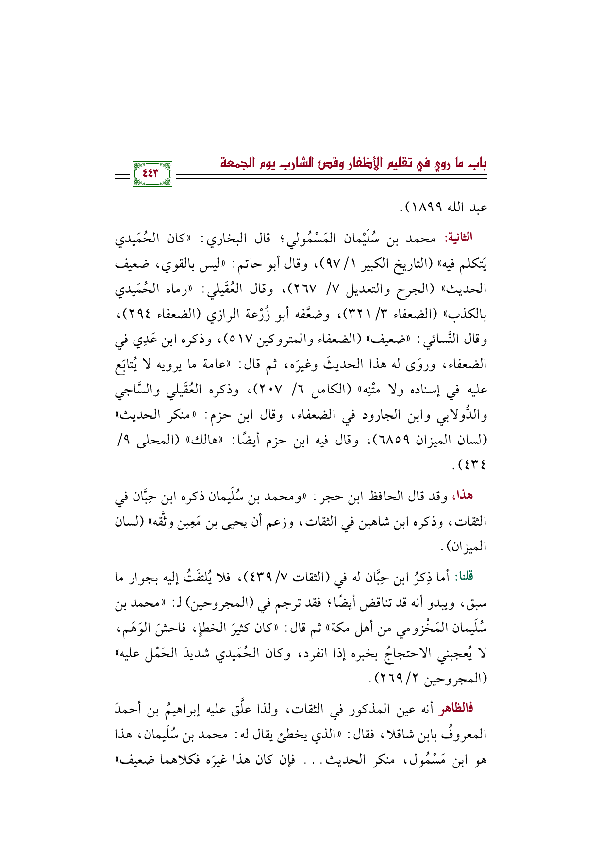 قلنا: أما ذِكرُ ابن حِبَّان له في (الثقات ٧/ ٤٣٩)، فلا يُلتفَتُ إليه بجوار ما سبق، ويبدو أنه قد تناقض أيضًا؛ فقد ترجم في (المجروحين) لـ: "محمد بن سُلَيمان المَخْزومي من أهل مكة" ثم قال: "كان كثيرَ الخطإِ، فاحشَ الوَهَم، لا يُعجبني الاحتجاجُ بخبره إذا انفرد، وكان الحُمَيدي شديدَ الحَمْل عليه" (المجروحين ٢/ ٢٦٩).