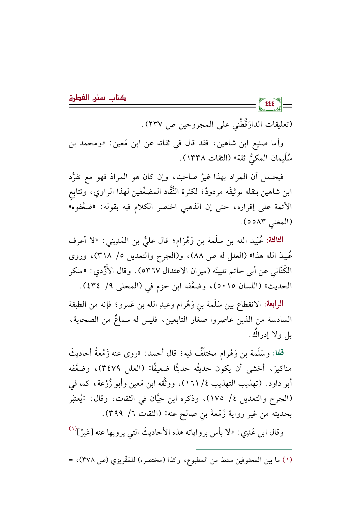 الرابعة: الانقطاع بين سَلَمة بنِ وَهْرام وعبدِ الله بن عَمرو؛ فإنه من الطبقة السادسة من الذين عاصروا صغار التابعين، فليس له سماعٌ من الصحابة، بل ولا إدراكٌ.