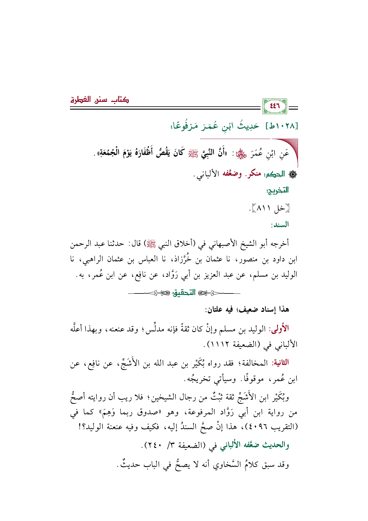وبُكَيْر ابن الأَشَجِّ ثقة ثبْتٌ من رجال الشيخين؛ فلا ريب أن روايته أصحُّ من رواية ابن أبي رَوَّاد المرفوعة، وهو "صدوق ربما وَهِمَ" كما في (التقريب ٤٠٩٦)، هذا إنْ صحَّ السندُ إليه، فكيف وفيه عنعنة الوليد؟ !