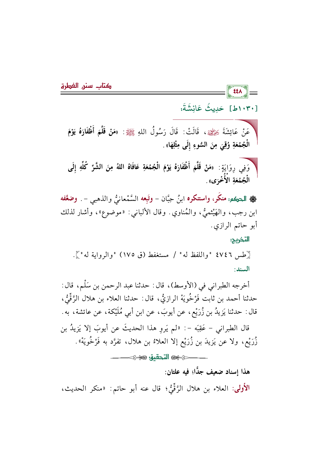 الأولى: العلاء بن هلال الرَّقِّيُّ؛ قال عنه أبو حاتم: "منكر الحديث،