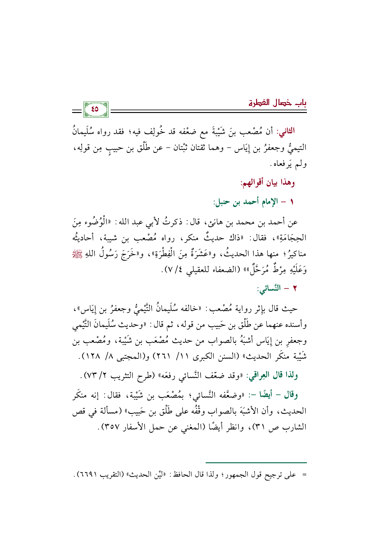 حيث قال بإِثر رواية مُصْعب: "خالفه سُلَيمانُ التَّيْميُّ وجعفرُ بن إِيَاس"، وأسنده عنهما عن طَلْق بن حَبيب من قوله، ثم قال: "وحديث سُلَيمانَ التَّيْمي وجعفرِ بن إِيَاس أشبَهُ بالصواب من حديث مُصْعَب بن شَيْبة، ومُصْعب بن شَيْبة منكَر الحديث" (السنن الكبرى ١١/ ٢٦١) و (المجتبى ٨/ ١٢٨).