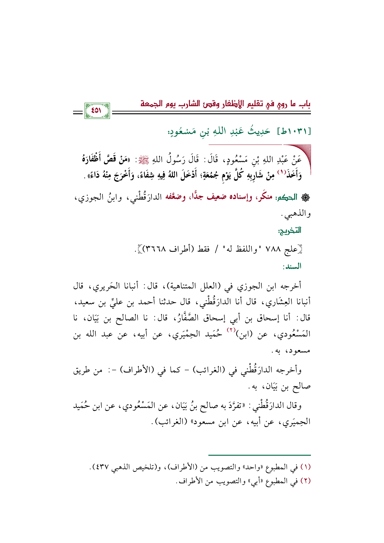 أخرجه ابن الجوزي في (العلل المتناهية)، قال: أنبانا الحَريري، قال أنبانا العِشَاري، قال أنا الدارَقُطْني، قال حدثنا أحمد بن عليِّ بن سعيد، قال: أنا إسحاق بن أبي إسحاق الصَّفَّارُ، قال: نا الصالح بن بَيَان، نا المَسْعُودي، عن (ابن) (¬٢) حُمَيد الحِمْيَري، عن أبيه، عن عبد الله بن مسعود، به.