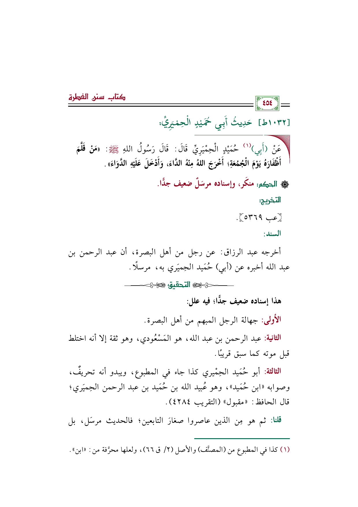 أخرجه عبد الرزاق: عن رجل من أهل البصرة، أن عبد الرحمن بن عبد الله أخبره عن (أبي) حُمَيد الحِميَري به، مرسلًا.