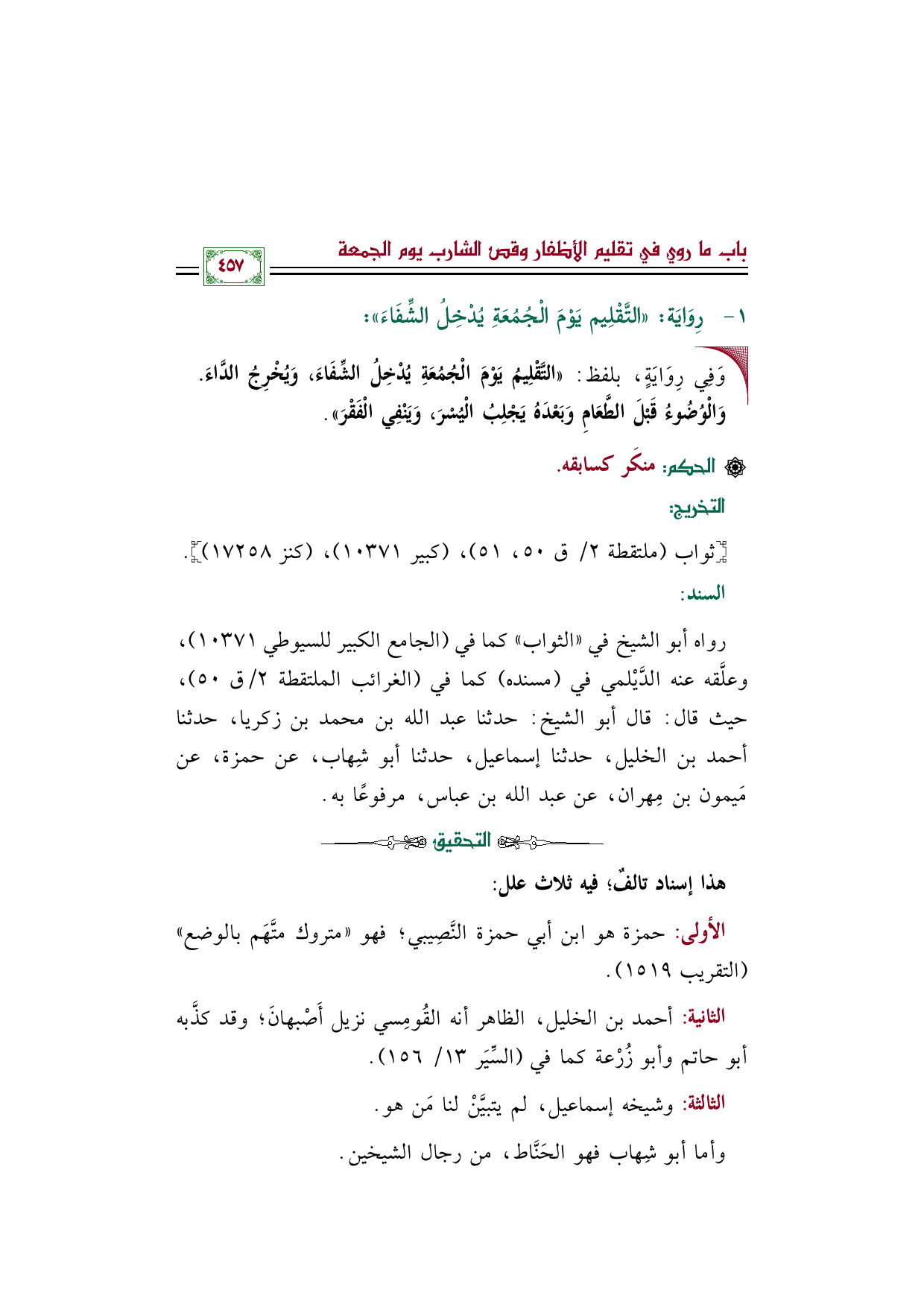 الأولى: حمزة هو ابن أبي حمزة النَّصِيبي؛ فهو "متروك متَّهَم بالوضع" (التقريب ١٥١٩).