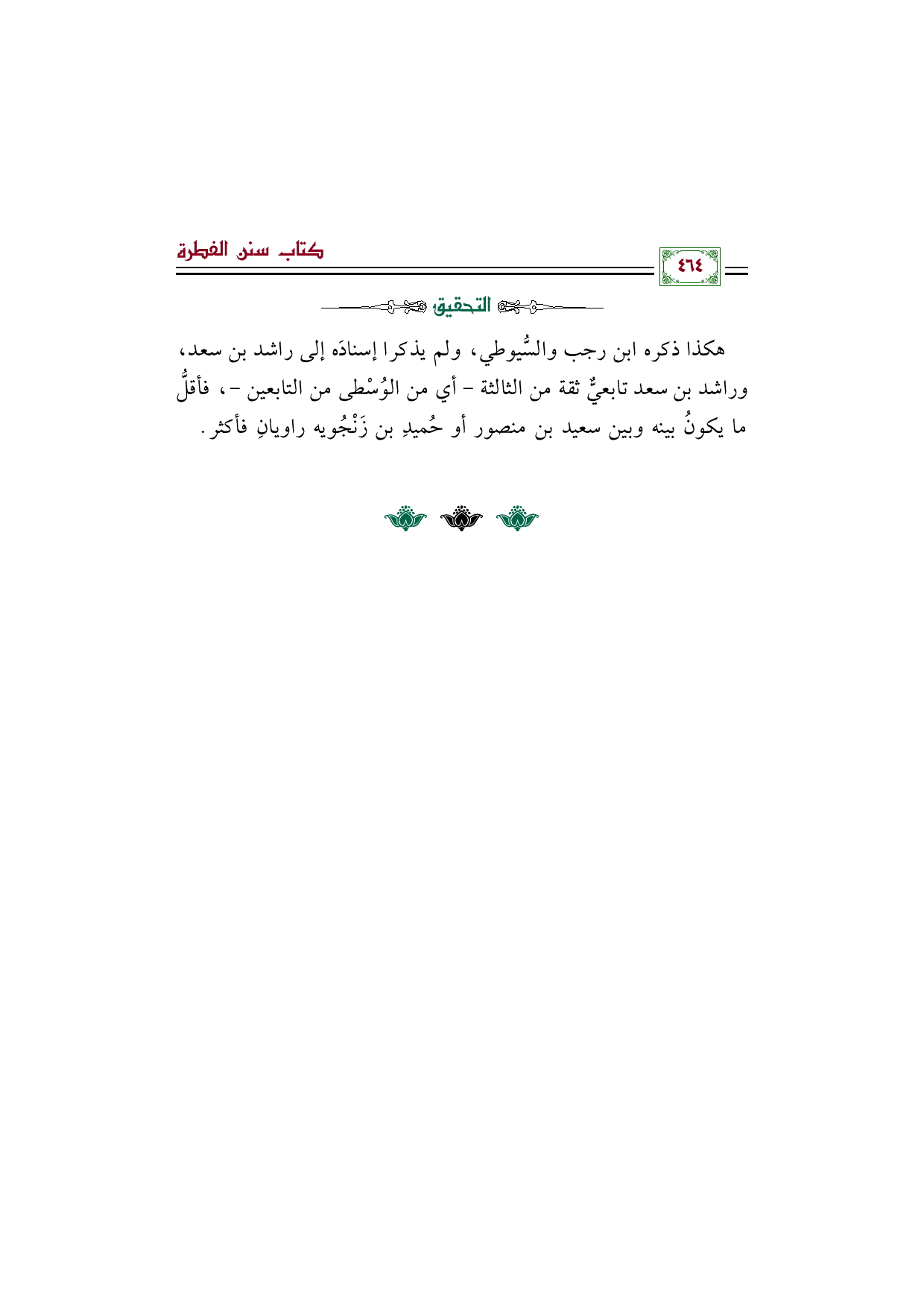 هكذا ذكره ابن رجب والسُّيوطي، ولم يذكرا إسنادَه إلى راشد بن سعد، وراشد بن سعد تابعيٌّ ثقة من الثالثة- أي من الوُسْطى من التابعين-، فأقلُّ ما يكونُ بينه وبين سعيد بن منصور أو حُميدِ بن زَنْجُويه راويانِ فأكثر.
