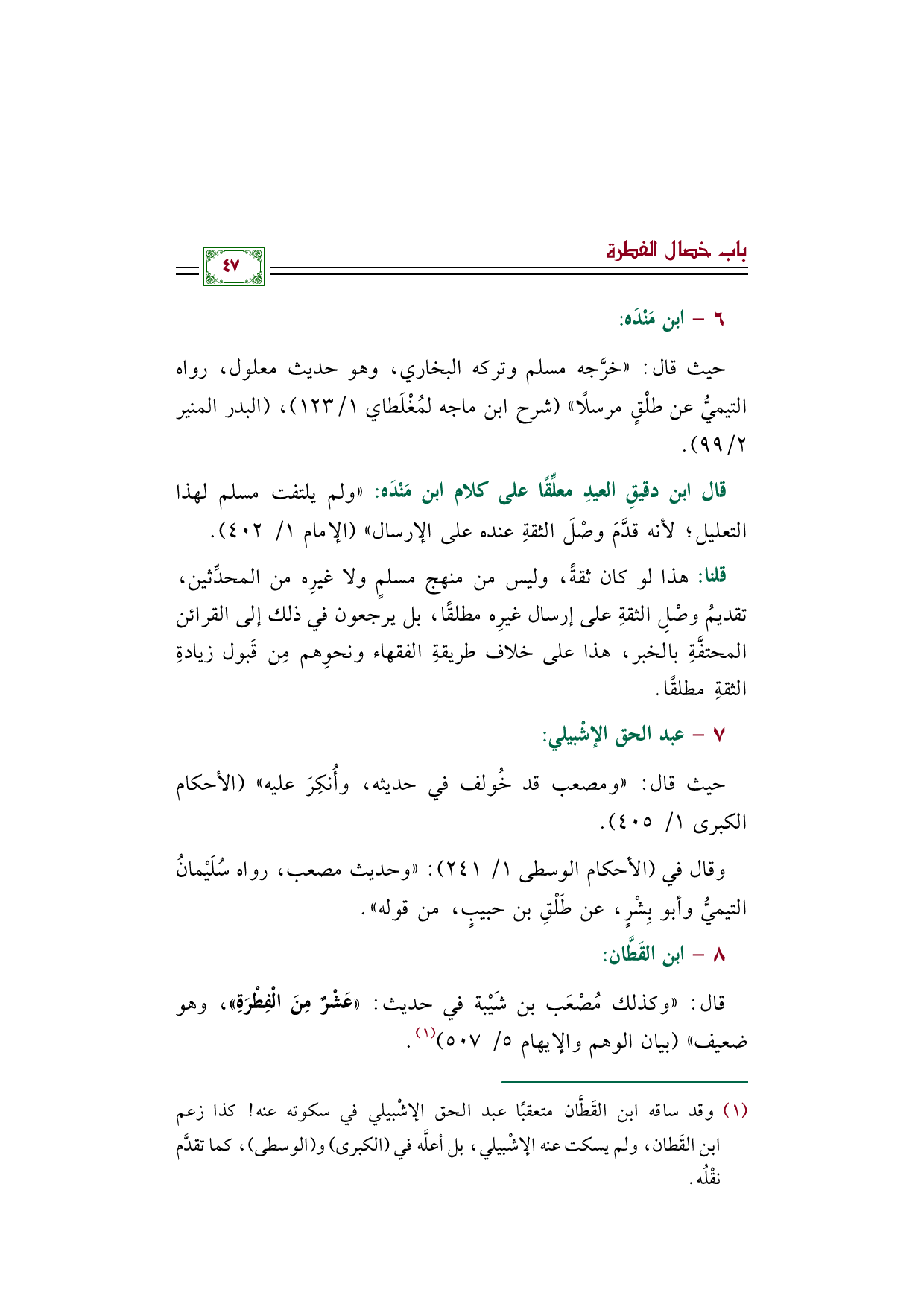 قال ابن دقيقِ العيدِ معلِّقًا على كلام ابن مَنْدَه: "ولم يلتفت مسلم لهذا التعليل؛ لأنه قدَّمَ وصْلَ الثقةِ عنده على الإرسال" (الإمام ١/ ٤٠٢).
