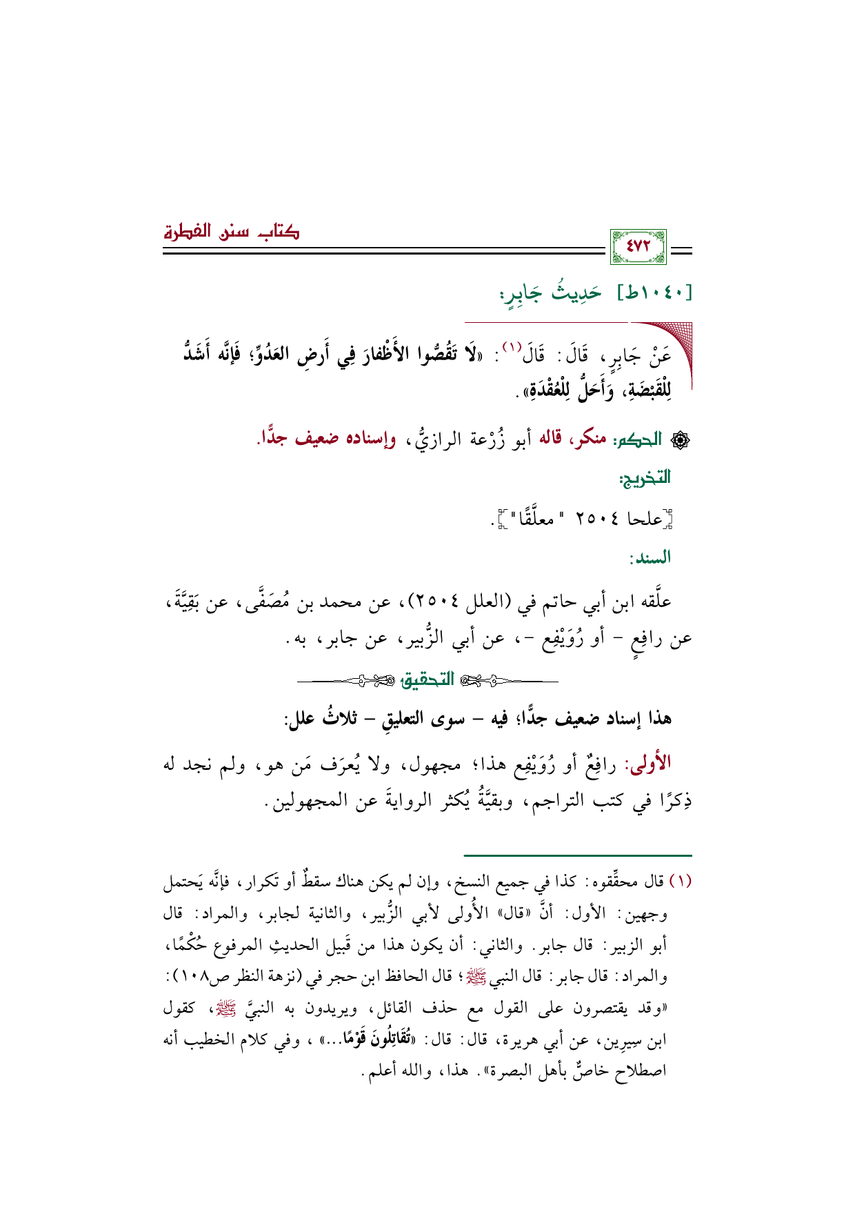 علَّقه ابن أبي حاتم في (العلل ٢٥٠٤)، عن محمد بن مُصَفَّى، عن بَقِيَّةَ، عن رافِعٍ- أو رُوَيْفِع-، عن أبي الزُّبير، عن جابر، به.
