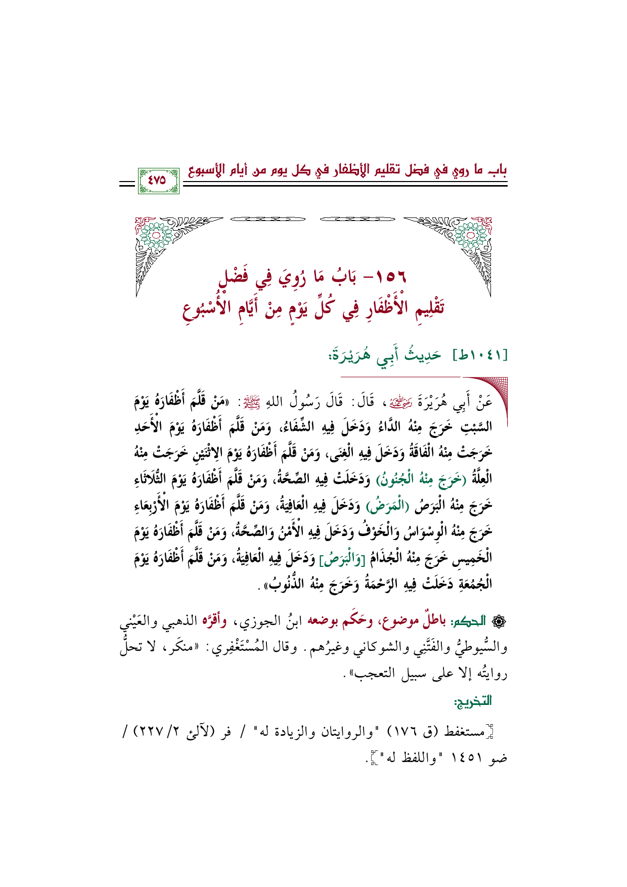 ◼ عَنْ أَبِي هُرَيْرَةَ رَضِيَ اللهُ عَنْهُ، قَالَ: قَالَ رَسُولُ اللهِ صَلَّى اللهُ عَلَيْهِ وَسَلَّمَ: ((مَنْ قَلَّمَ أَظْفَارَهُ يَوْمَ السَّبْتِ خَرَجَ مِنْهُ الدَّاءُ وَدَخَلَ فِيهِ الشِّفَاءُ، وَمَنْ قَلَّمَ أَظْفَارَهُ يَوْمَ الْأَحَدِ خَرَجَتْ مِنْهُ الْفَاقَةُ وَدَخَلَ فِيهِ الْغِنَى، وَمَنْ قَلَّمَ أَظْفَارَهُ يَوْمَ الِاثْنَيْنِ خَرَجَتْ مِنْهُ الْعِلَّةُ (خَرَجَ مِنْهُ الْجُنُونُ) وَدَخَلَتْ فِيهِ الصِّحَّةُ، وَمَنْ قَلَّمَ أَظْفَارَهُ يَوْمَ الثُّلَاثَاءِ خَرَجَ مِنْهُ الْبَرَصُ (الْمَرَضُ) وَدَخَلَ فِيهِ الْعَافِيَةُ، وَمَنْ قَلَّمَ أَظْفَارَهُ يَوْمَ الْأَرْبِعَاءِ خَرَجَ مِنْهُ الْوِسْوَاسُ وَالْخَوْفُ وَدَخَلَ فِيهِ الْأَمْنُ وَالصِّحَّةُ، وَمَنْ قَلَّمَ أَظْفَارَهُ يَوْمَ الْخَمِيسِ خَرَجَ مِنْهُ الْجُذَامُ [وَالْبَرَصُ] وَدَخَلَ فِيهِ الْعَافِيَةُ، وَمَنْ قَلَّمَ أَظْفَارَهُ يَوْمَ الْجُمُعَةِ دَخَلَتْ فِيهِ الرَّحْمَةُ وَخَرَجَ مِنْهُ الذُّنُوبُ)).
