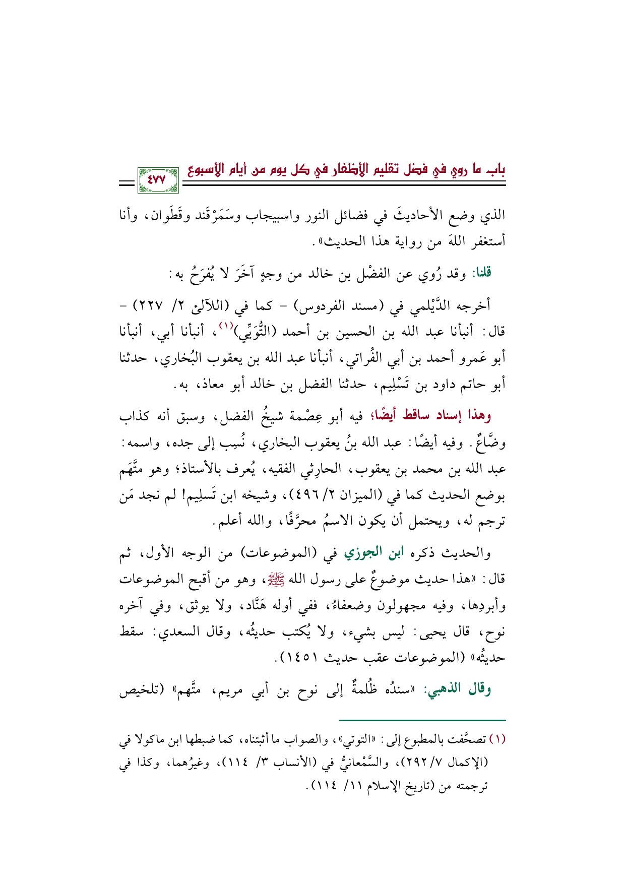 وهذا إسناد ساقط أيضًا؛ فيه أبو عِصْمة شيخُ الفضل، وسبق أنه كذاب وضَّاعٌ. وفيه أيضًا: عبد الله بنُ يعقوب البخاري، نُسِب إلى جده، واسمه: عبد الله بن محمد بن يعقوب، الحارِثي الفقيه، يُعرف بالأستاذ؛ وهو متَّهَم بوضع الحديث كما في (الميزان ٢/ ٤٩٦)، وشيخه ابن تَسلِيم! لم نجد مَن ترجم له، ويحتمل أن يكون الاسمُ محرَّفًا، والله أعلم.
