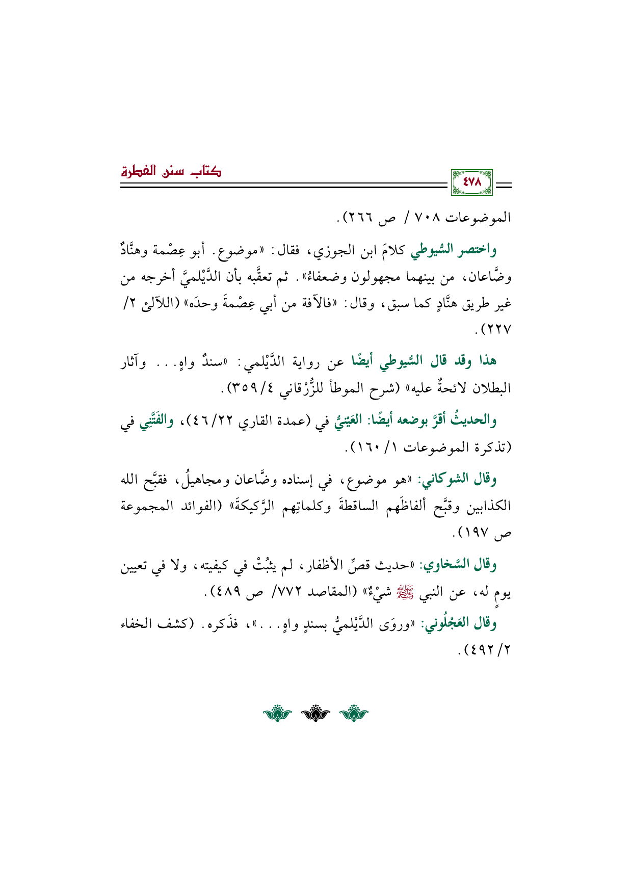 هذا وقد قال السُّيوطي أيضًا عن رواية الدَّيْلمي: "سندٌ واهٍ ... وآثار البطلان لائحةٌ عليه" (شرح الموطأ للزُّرْقاني ٤/ ٣٥٩).