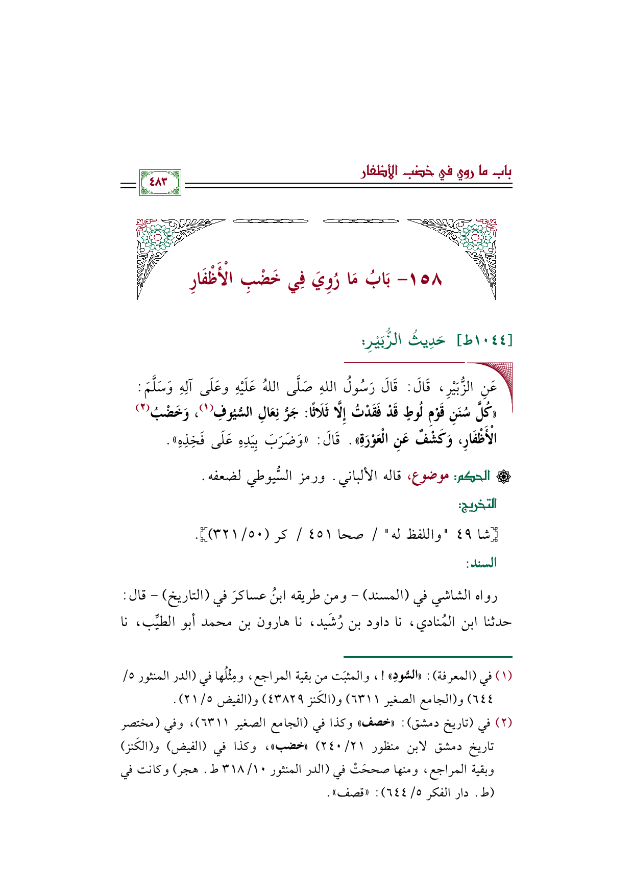 (¬٢) - في تاريخ دمشق "خصف" وكذا في (الجامع الصغير ٦٣١١)، وفي (مختصر تاريخ دمشق لابن منظور ٢١/ ٢٤٠) "خضب"، وكذا في الفيض والكَنز وبقية المراجع، ومنها صححَتْ في (الدر المنثور ١٠/ ٣١٨ ط. هجر) وكانت في (ط. دار الفكر ٥/ ٦٤٤): "قصف".