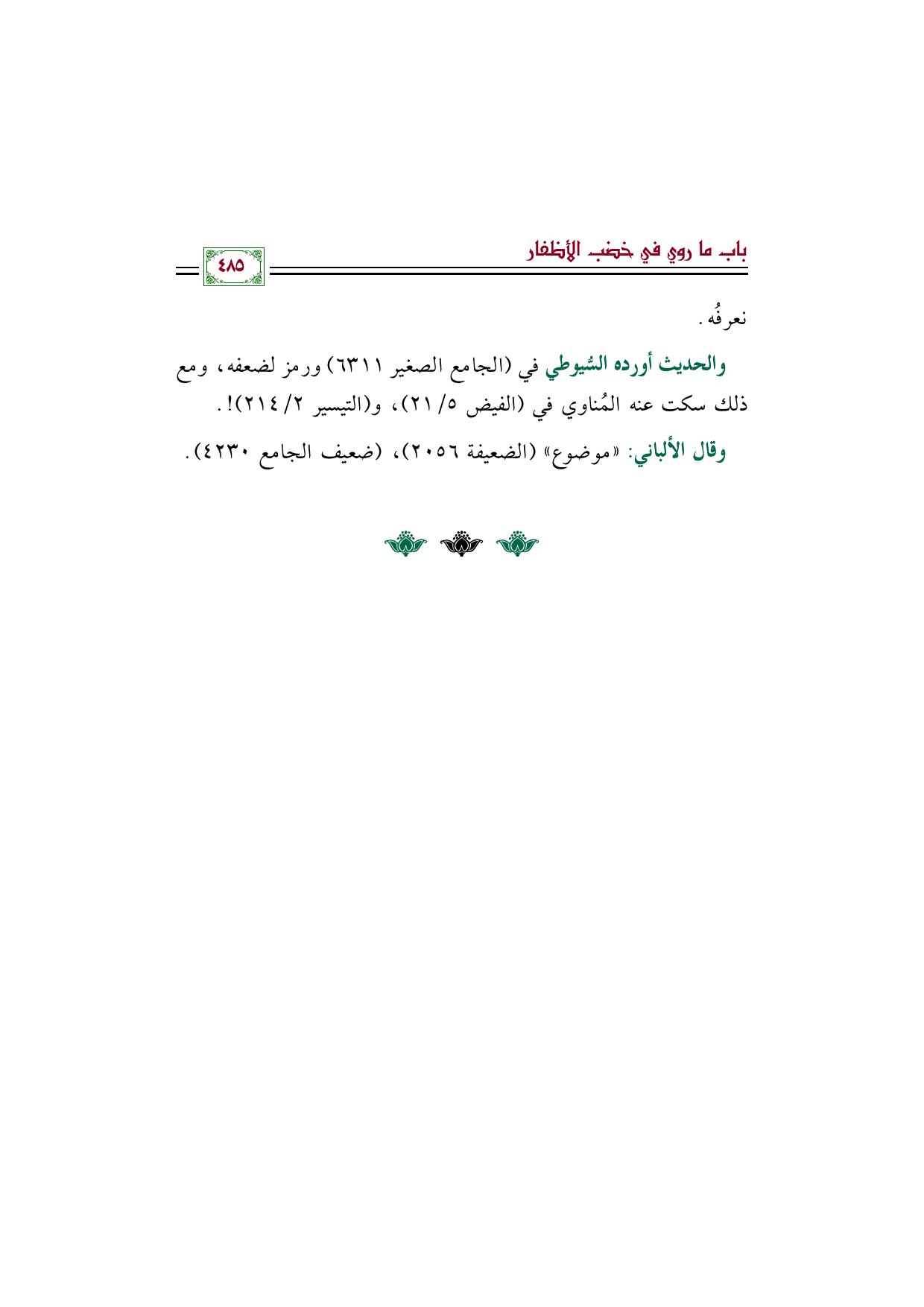 والحديث أورده السُّيوطي في (الجامع الصغير ٦٣١١) ورمز لضعفه، ومع ذلك سكت عنه المُناوي في (الفيض ٥/ ٢١)، و (التيسير ٢/ ٢١٤)!.
