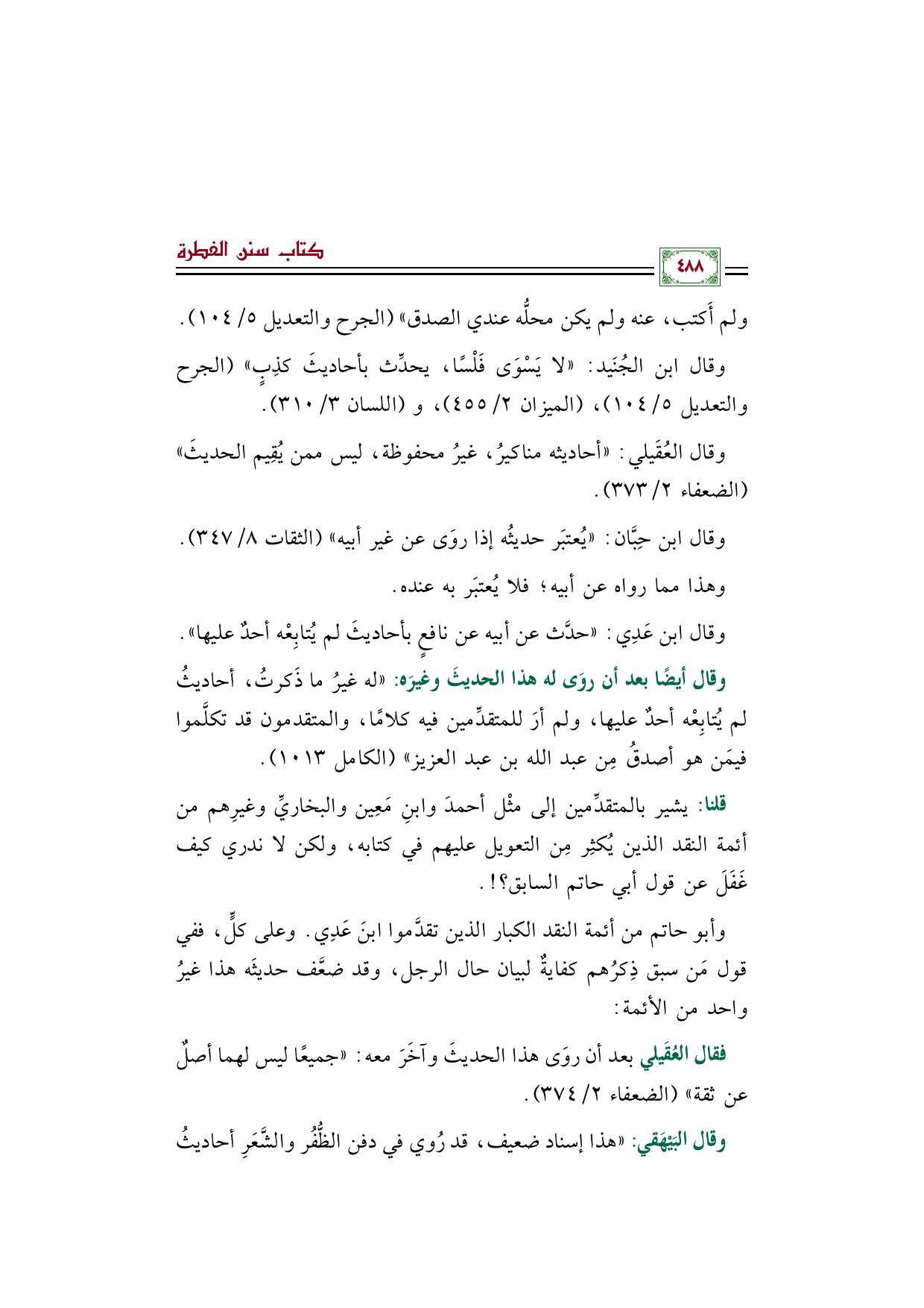 وأبو حاتم من أئمة النقد الكبار الذين تقدَّموا ابنَ عَدِي. وعلى كلٍّ، ففي قول مَن سبق ذِكرُهم كفايةٌ لبيان حال الرجل، وقد ضعَّف حديثَه هذا غيرُ واحد من الأئمة: