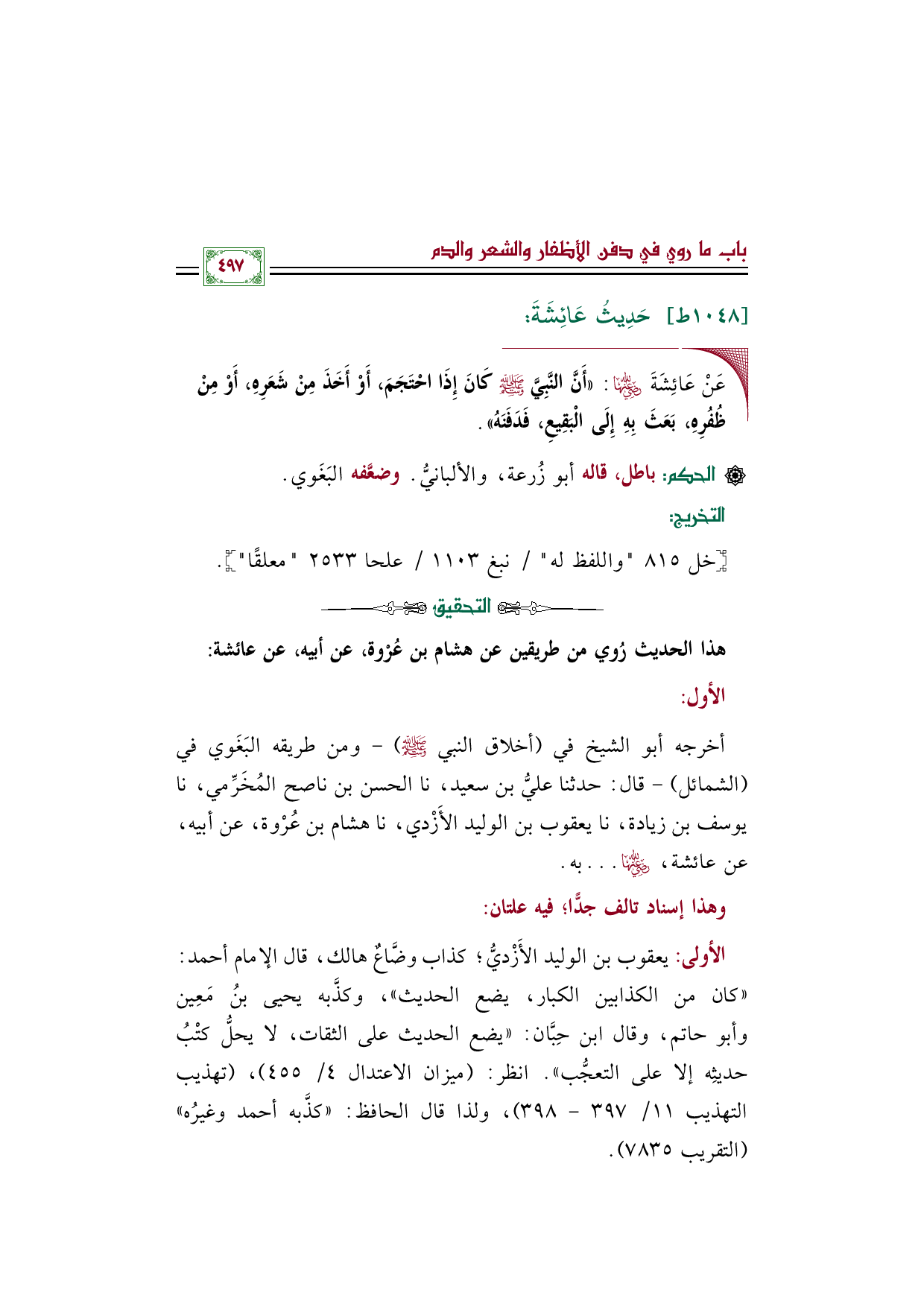 أخرجه أبو الشيخ في (أخلاق النبي صلى الله عليه وسلم) - ومن طريقه البَغَوي في (الشمائل) - قال: حدثنا عليُّ بن سعيد، نا الحسن بن ناصح المُخَرِّمي، نا يوسف بن زيادة، نا يعقوب بن الوليد الأَزْدي، نا هشام بن عُرْوة، عن أبيه، عن عائشة، رضي الله عنها ... به.