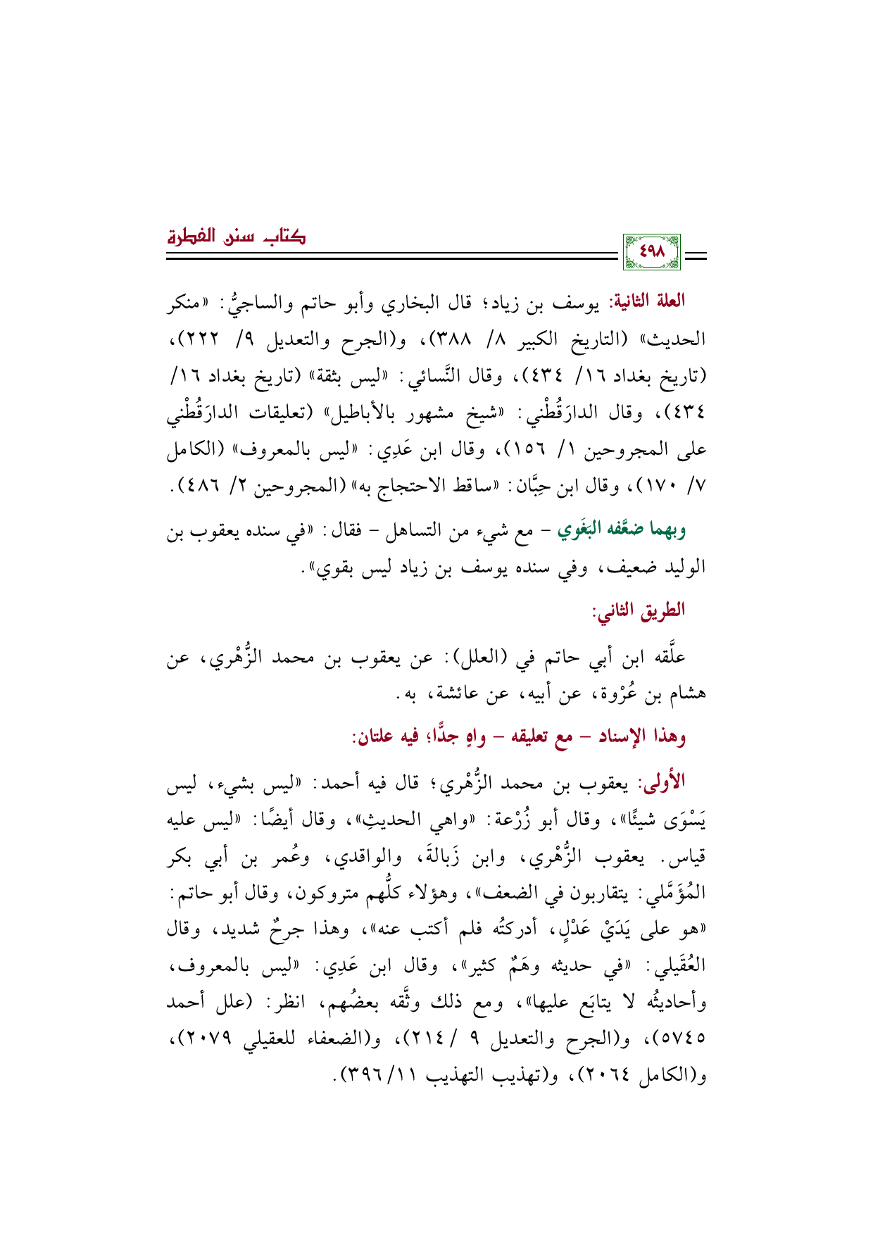 الأولى: يعقوب بن محمد الزُّهْري؛ قال فيه أحمد: "ليس بشيء، ليس يَسْوَى شيئًا"، وقال أبو زُرْعة: "واهي الحديثِ"، وقال أيضًا: "ليس عليه قياس. يعقوب الزُّهْري، وابن زَبالةَ، والواقدي، وعُمر بن أبي بكر المُؤَمَّلي: يتقاربون في الضعف"، وهؤلاء كلُّهم متروكون، وقال أبو حاتم: "هو على يَدَيْ عَدْلٍ، أدركتُه فلم أكتب عنه"، وهذا جرحٌ شديد، وقال العُقَيلي: "في حديثه وهَمٌ كثير"، وقال ابن عَدِي: "ليس بالمعروف، وأحاديثُه لا يتابَع عليها"، ومع ذلك وثَّقه بعضُهم، انظر: (علل أحمد ٥٧٤٥)، و (الجرح والتعديل ٩/ ٢١٤)، و (الضعفاء للعقيلي ٢٠٧٩)، و (الكامل ٢٠٦٤)، و (تهذيب التهذيب ١١/ ٣٩٦).