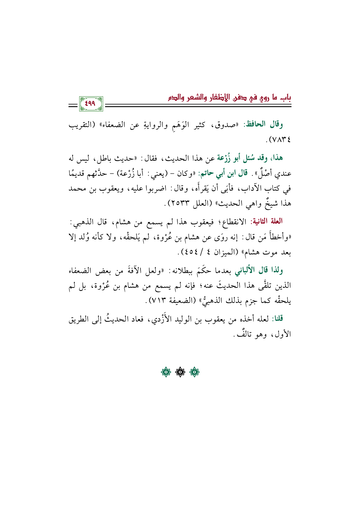 هذا، وقد سُئل أبو زُرْعة عن هذا الحديث، فقال: "حديث باطل، ليس له عندي أصْلٌ". قال ابن أبي حاتم: "وكان- (يعني: أبا زُرْعة) - حدَّثهم قديمًا في كتاب الآداب، فأبَى أن يَقرأَه، وقال: اضربوا عليه، ويعقوب بن محمد هذا شيخٌ واهي الحديث" (العلل ٢٥٣٣).