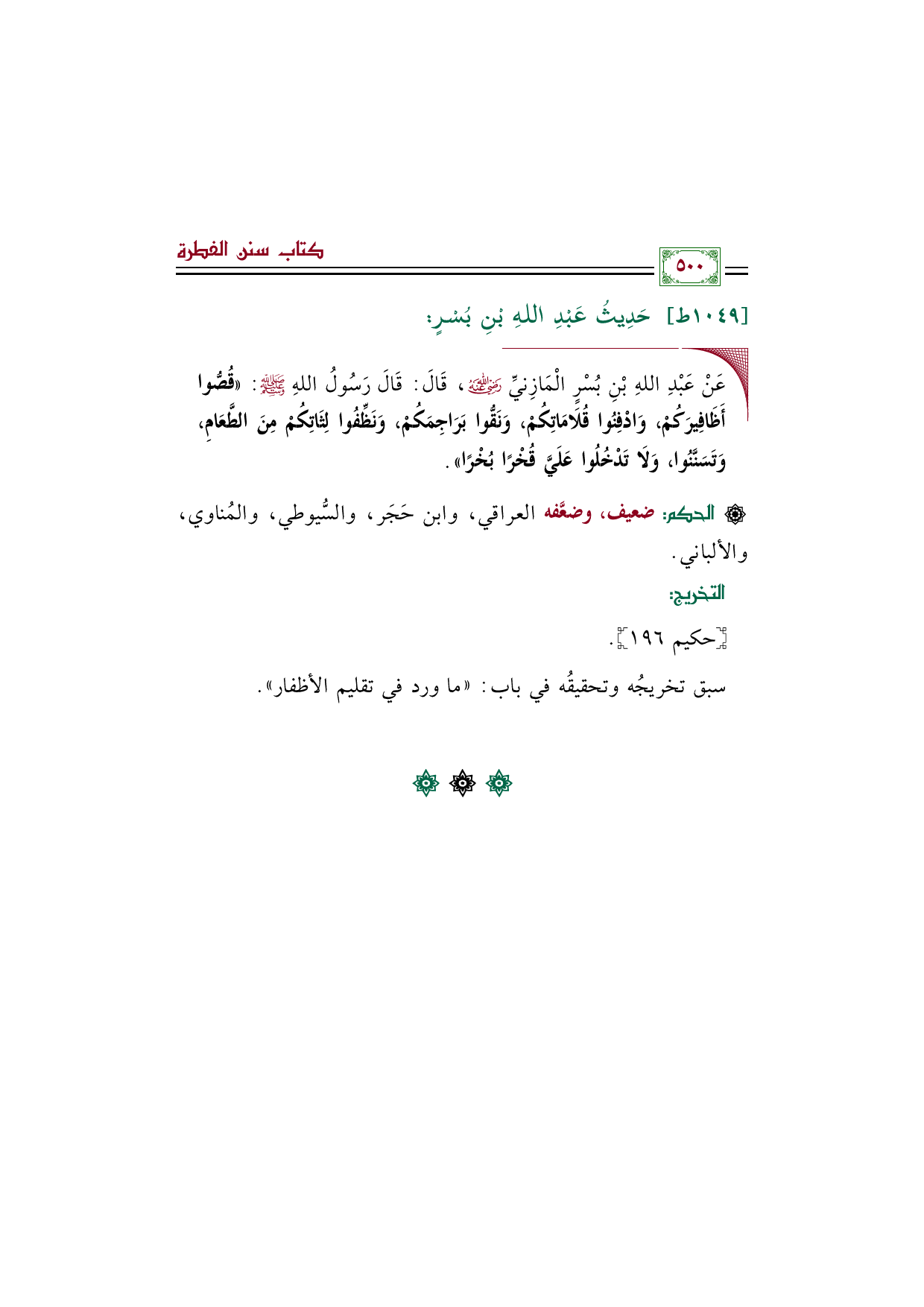 ◼ عَنْ عَبْدِ اللهِ بْنِ بُسْرٍ الْمَازِنيِّ رَضِيَ اللهُ عَنْهُ، قَالَ: قَالَ رَسُولُ اللهِ صَلَّى اللهُ عَلَيْهِ وَسَلَّمَ: ((قُصُّوا أَظَافِيرَكُمْ، وَادْفِنُوا قُلَامَاتِكُمْ، وَنَقُّوا بَرَاجِمَكُمْ، وَنَظِّفُوا لِثَاتِكُمْ مِنَ الطَّعَامِ، وَتَسَنَّنُوا، وَلَا تَدْخُلُوا عَلَيَّ قُخْرًا بُخْرًا)).