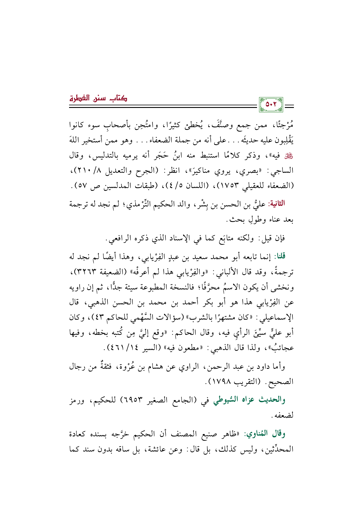 وقال المُناوي: "ظاهر صنيع المصنف أن الحكيم خرَّجه بسنده كعادة المحدِّثين، وليس كذلك، بل قال: وعن عائشة، بل ساقه بدون سند كما