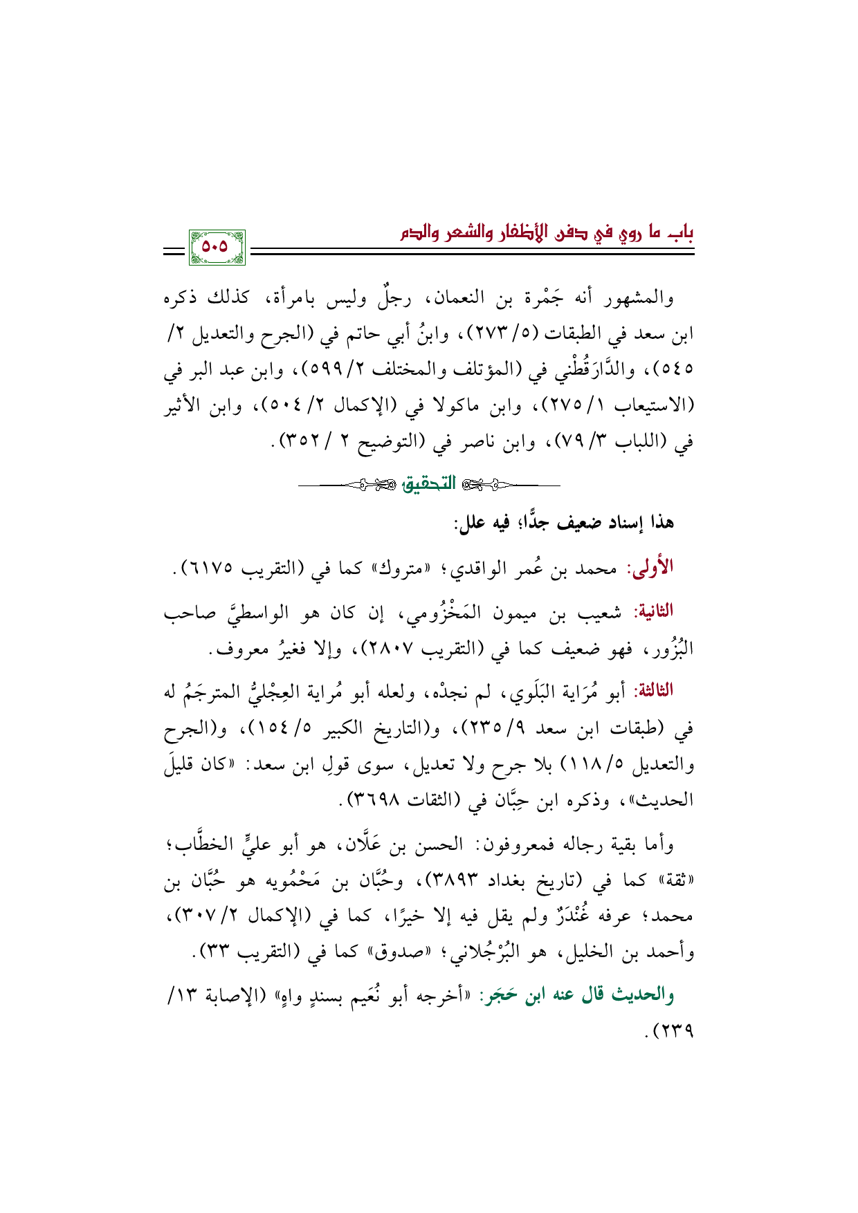 الأولى: محمد بن عُمر الواقدي؛ "متروك" كما في (التقريب ٦١٧٥).