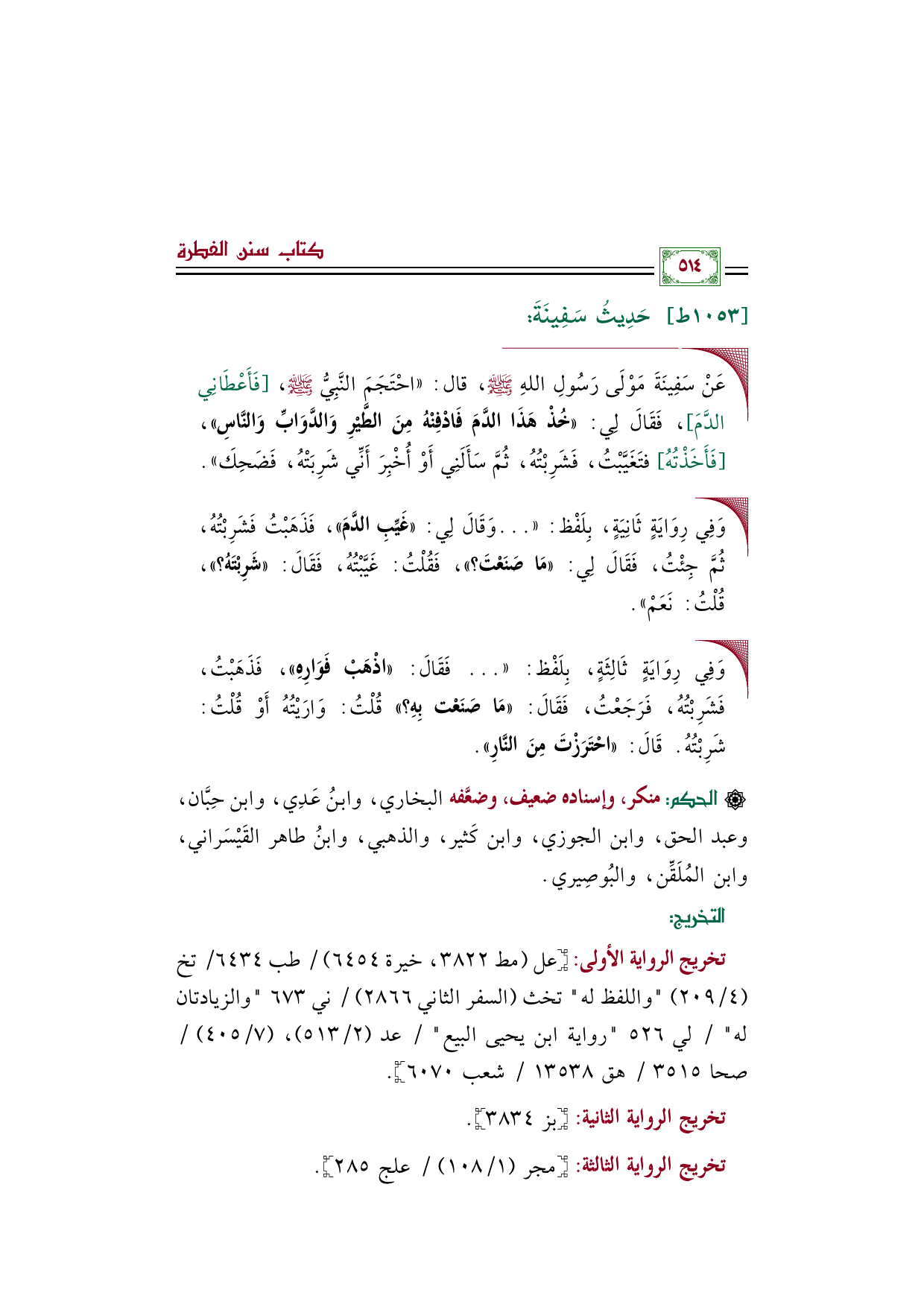تخريج الرواية الأولى: [عل (مط ٣٨٢٢، خيرة ٦٤٥٤) / طب ٦٤٣٤/ تخ (٤/ ٢٠٩) "واللفظ له" تخث (السفر الثاني ٢٨٦٦) / ني ٦٧٣ "والزيادتان له" / لي ٥٢٦ "رواية ابن يحيى البيع" / عد (٢/ ٥١٣) , (٧/ ٤٠٥) / صحا ٣٥١٥ / هق ١٣٥٣٨ / شعب ٦٠٧٠]