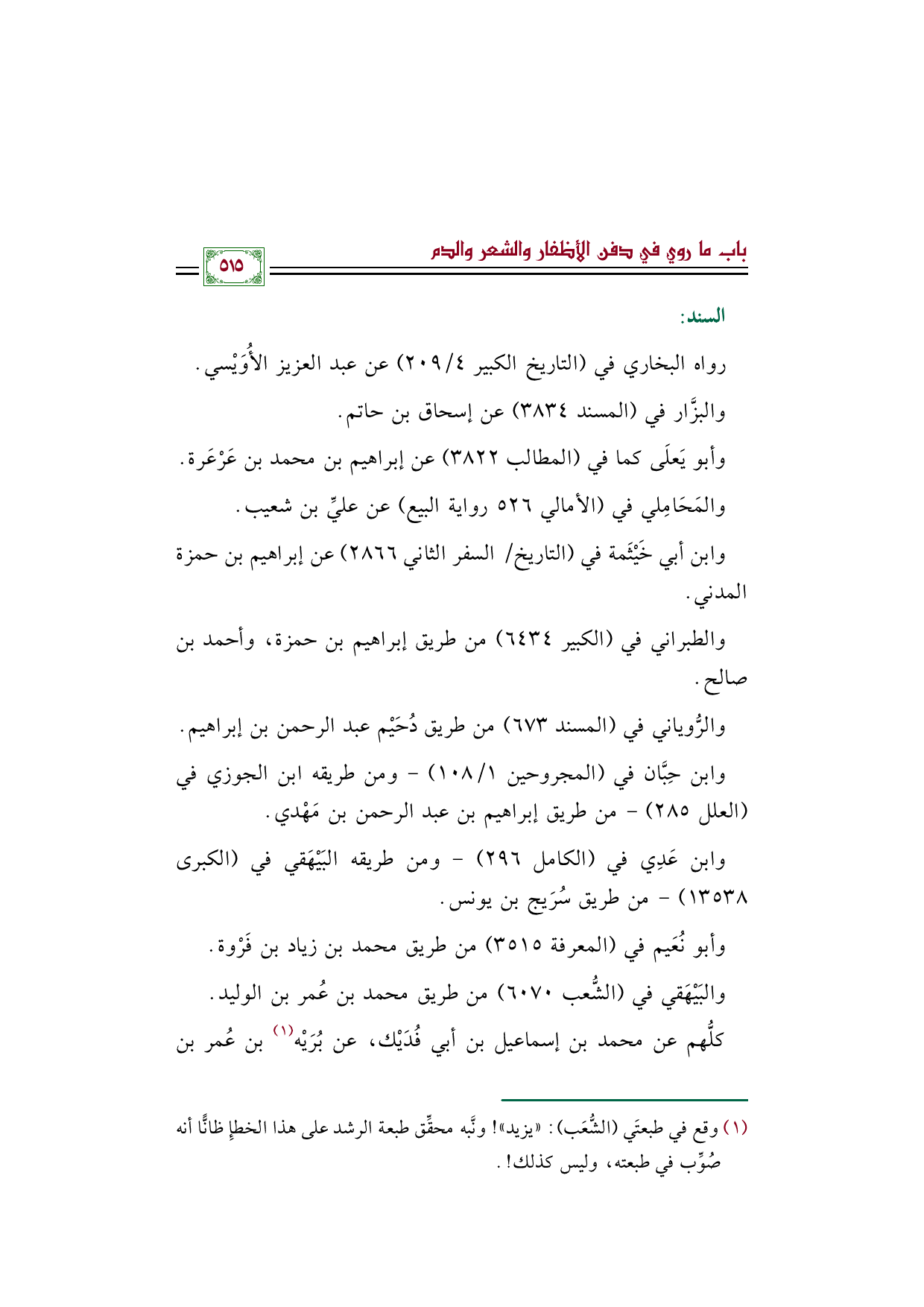 (¬١) - وقع في طبعتَي الشُّعَب: "يزيد"! ونَّبه محقِّق طبعة الرشد على هذا الخطإِ ظانًّا أنه صُوِّب في طبعته، وليس كذلك! .