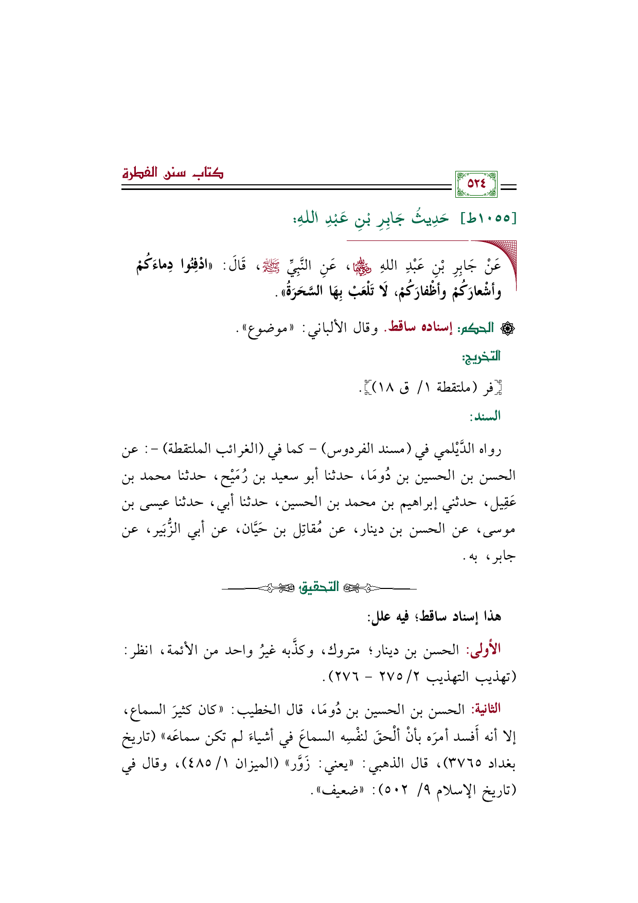 الثانية: الحسن بن الحسين بن دُومَا، قال الخطيب: "كان كثيرَ السماع، إلا أنه أَفسد أمرَه بأنْ ألْحقَ لنفْسِه السماعَ في أشياءَ لم تكن سماعَه" (تاريخ بغداد ٣٧٦٥)، قال الذهبي: "يعني: زَوَّر" (الميزان ١/ ٤٨٥)، وقال في (تاريخ الإسلام ٩/ ٥٠٢): "ضعيف".
