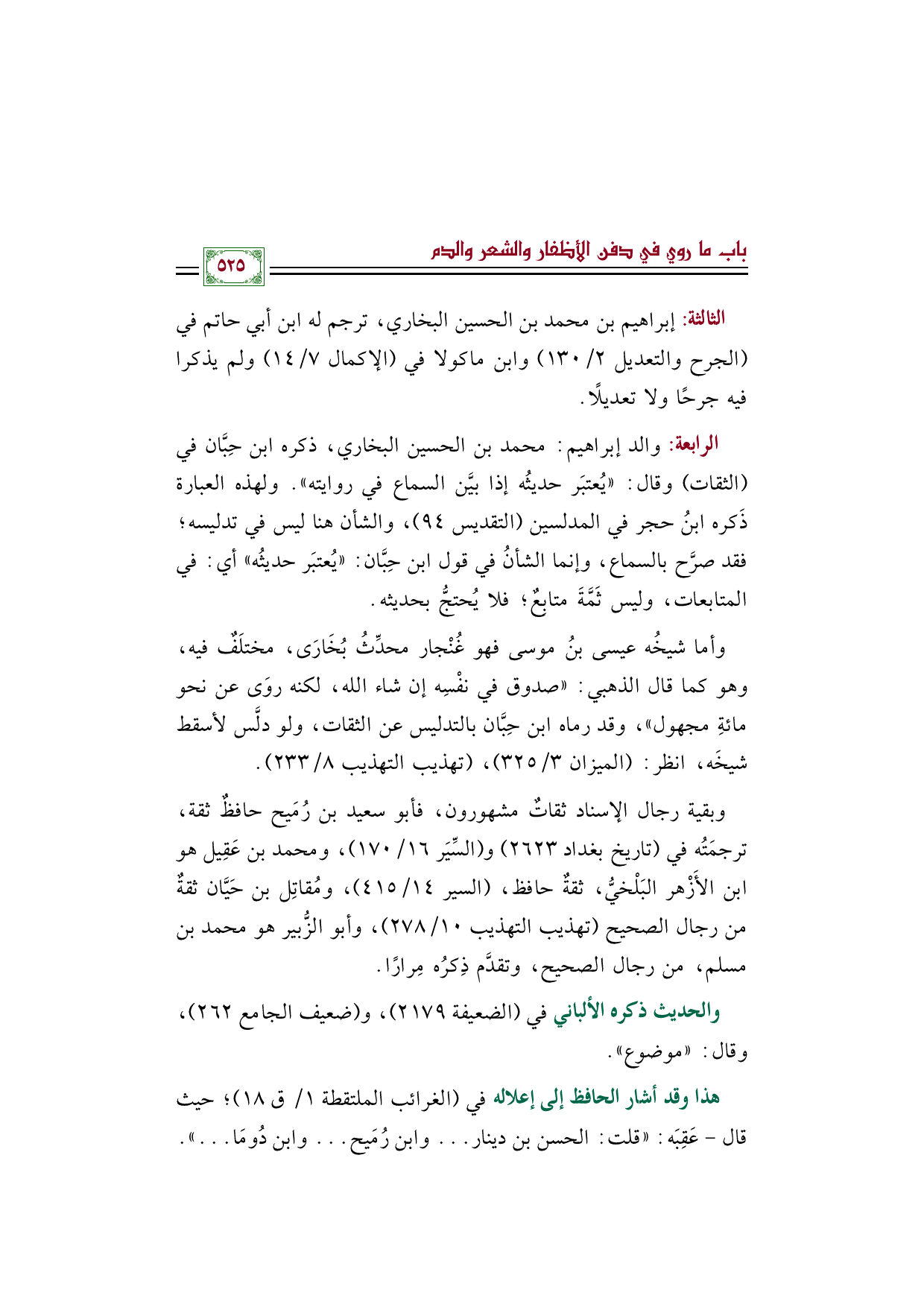 الرابعة: والد إبراهيم: محمد بن الحسين البخاري، ذكره ابن حِبَّان في (الثقات) وقال: "يُعتبَر حديثُه إذا بيَّن السماع في روايته". ولهذه العبارة ذَكره ابنُ حجر في المدلسين (التقديس ٩٤)، والشأن هنا ليس في تدليسه؛ فقد صرَّح بالسماع، وإنما الشأنُ في قول ابن حِبَّان: "يُعتبَر حديثُه" أي: في المتابعات، وليس ثَمَّةَ متابِعٌ؛ فلا يُحتجُّ بحديثه.
